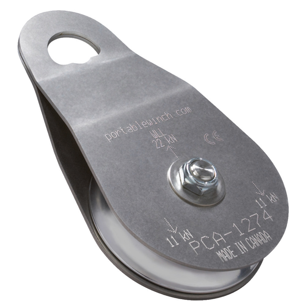 Leichte und robuste Portable Winch PCWUmlenkrolle mit schwenkbaren Seitenteilen, 100mm Rolle aus Aluminium,passend für Seile von 6 bis 13mm, 1,1 kg Gewicht,NICHT für Stahlseile konzipiert!Mindestbruchlast 90 kN,Windenzugkraft max. 4,5 t.