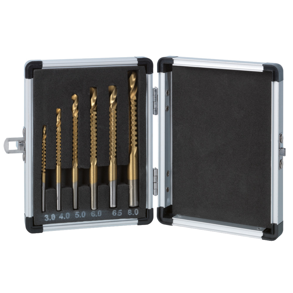 Einer für alles. Zum Bohren im Holz, Metall, Kunststoff und Mischmateralien.Mit „Fräsfunktion“ zum Erweitern von Löchern, Bearbeitung von Rundungen usw. Metallkassette mit je 1 Stk. Fräsbohrer: 3x60mm, 4x67mm, 5x80mm, 6x85mm, 6,5x85mm, 8x95mm.