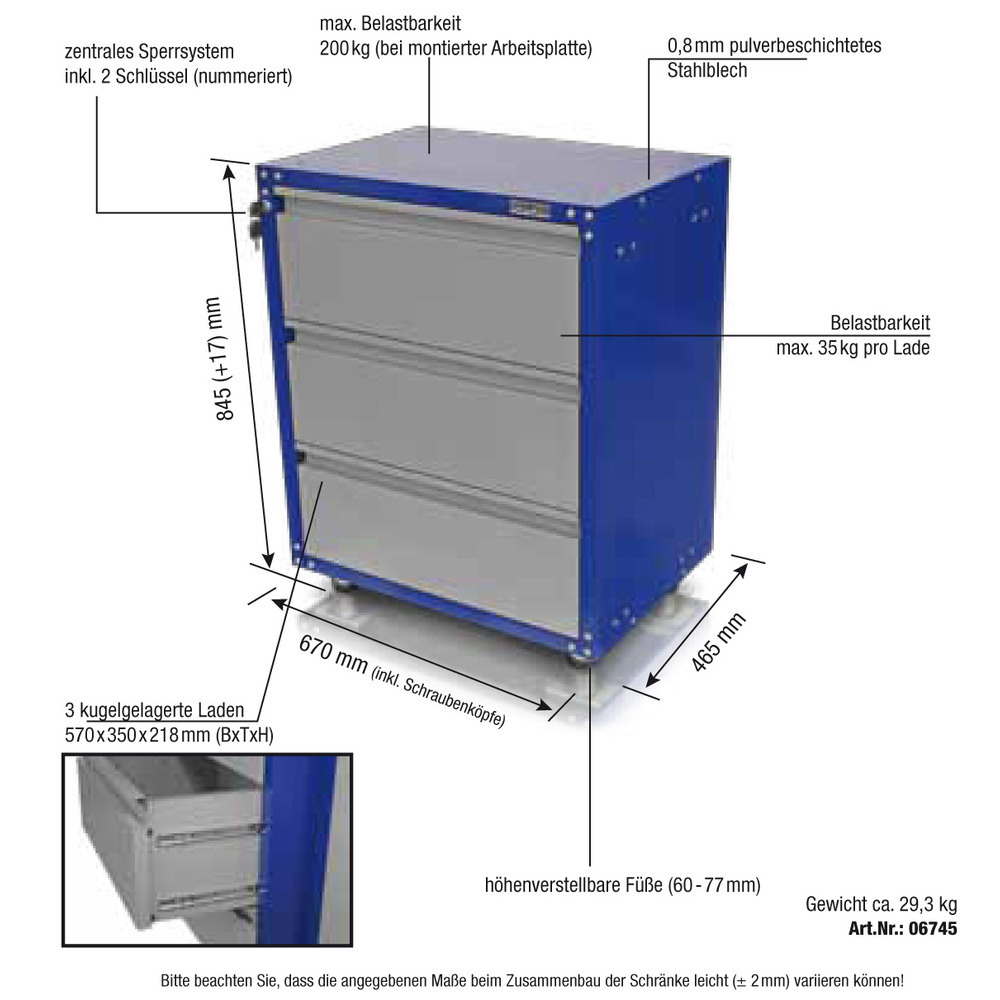 Versperrbarer Unterschrank 3 LadenAbmessungen inkl. Füße BxTxH: 670x465x845 mmAbmessung pro Lade: BxTxH: 570x350x218 mmmax. Belastbarkeit: 35 kgkugelgelagerte Schubladenhöhenverstellbare FüßeInkl. 2 Schlüssel