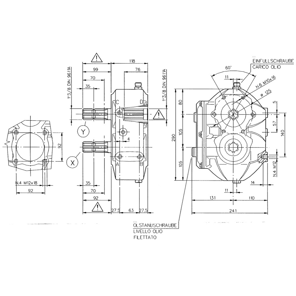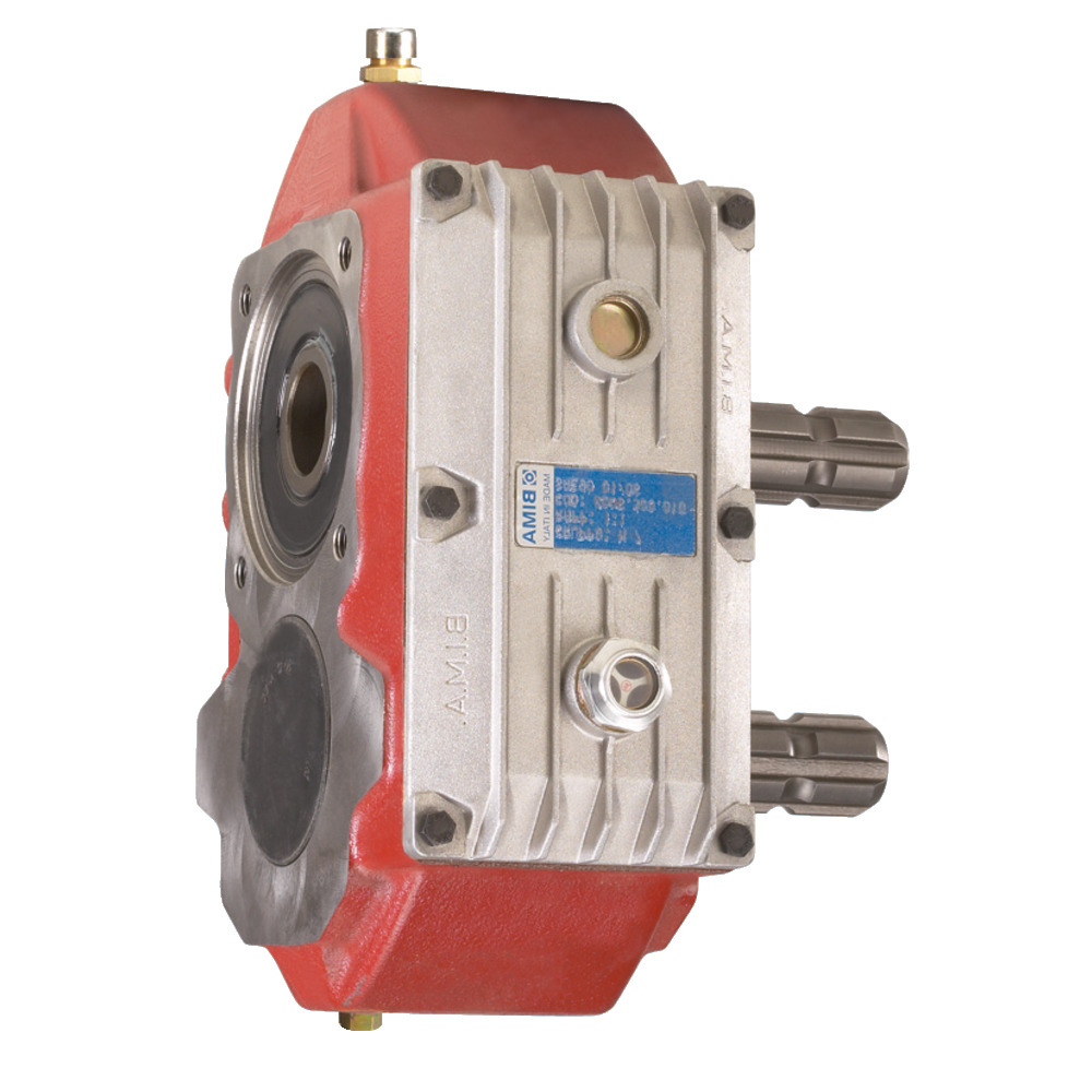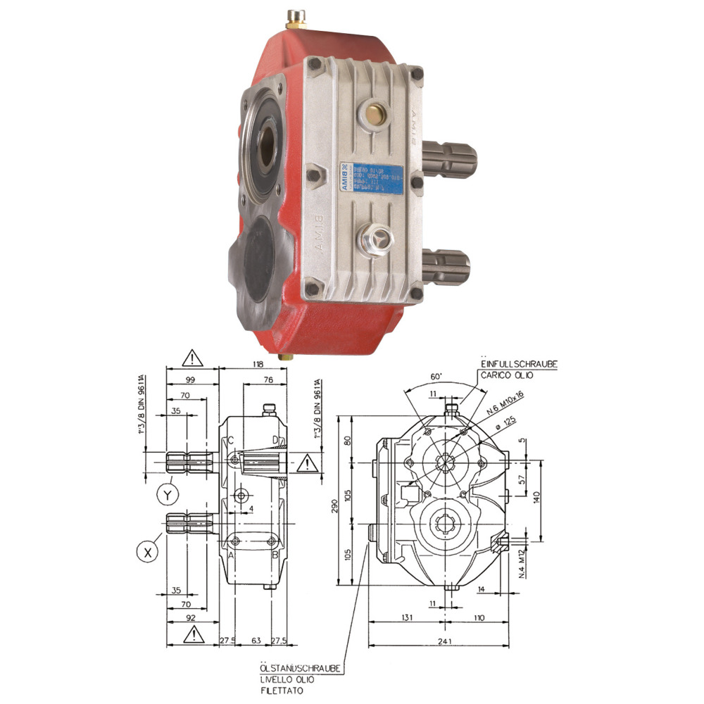 Speziell geeignet für den Anbau an der Frontzapfwelle zur Änderung der Drehrichtung und Reduzierung der Drehzahl von 1000 U/min auf 526 U/min. Die Montage des Getriebes erfolgt Traktorseitig.Eingang Y:Zapfwellenstummel oder Innenverzahnung540/1000 U/min, 26,4/51,5 kW, 477/928 NmAnschluss 1 3/8x6, Innen oder AußenverzahnungMöglichkeit mit Durchtrieb 1:1 (Drehrichtung gleichbleibend).Ausgang X:284/526 U/min, 482/895 NmAnschluss 1 3/8x6 AußenverzahnungDrehrichtungsumkehrIm allgemeinen führen Drehmomentspitzen bis zum 2-fachen des Nenndrehmoments zu keiner Beschädigung der einzelnen Getriebebauteile. Vollständige Unversehrtheit kann jedoch nur durch eine geeignete Sicherheitsvorrichtung gewährleistet werden.