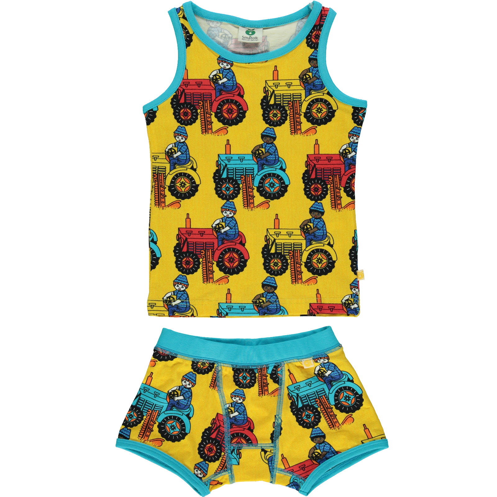 Unterwäsche-Set mit Traktoren, hergestellt aus organischem und dehnbarem Baumwolljersey. Dieses Set ist nach OEKO-TEX Standard 100® zertifiziert, was bedeutet, dass die Unterwäsche hergestellt und auf Schadstoffe getestet wurde, sodass Sie sich um die Haut und Gesundheit Ihres Kindes kümmern können. Das Set besteht aus einem ärmellosen Oberteil mit Rippenbündchen an Hals und Armlöchern sowie einer Unterhose mit Rippenbündchen und elastischem Bund. Das Unterwäscheset hat eine normale Passform. Die Unterwäsche von Småfolk wird in Dänemark mit dem Ziel entworfen, unzähligen Abenteuern und Spielen standzuhalten und auch nach mehrmaligem Gebrauch Form und Farbe zu behalten.Bei der Gestaltung der Drucke von Småfolk liegt der Schwerpunkt auf fröhlichen Farben, Details und Geschichten. Unsere Unterwäsche-Sets sind eine großartige Möglichkeit, der Garderobe Ihres Kindes Persönlichkeit zu verleihen und gleichzeitig dafür zu sorgen, dass sich Ihr Kind den ganzen Tag und die ganze Nacht wohlfühlt.Materialzusammensetzung: 95 % Bio-Baumwolle, 5 % Elasthan.Zertifizierung: OEKO-TEX STANDARD 100®.Waschanleitung: Maschinenwäsche 30°, nicht bleichen, nicht im Wäschetrockner trocknen, bei niedriger Temperatur bügelbar, nicht chemisch reinigen.