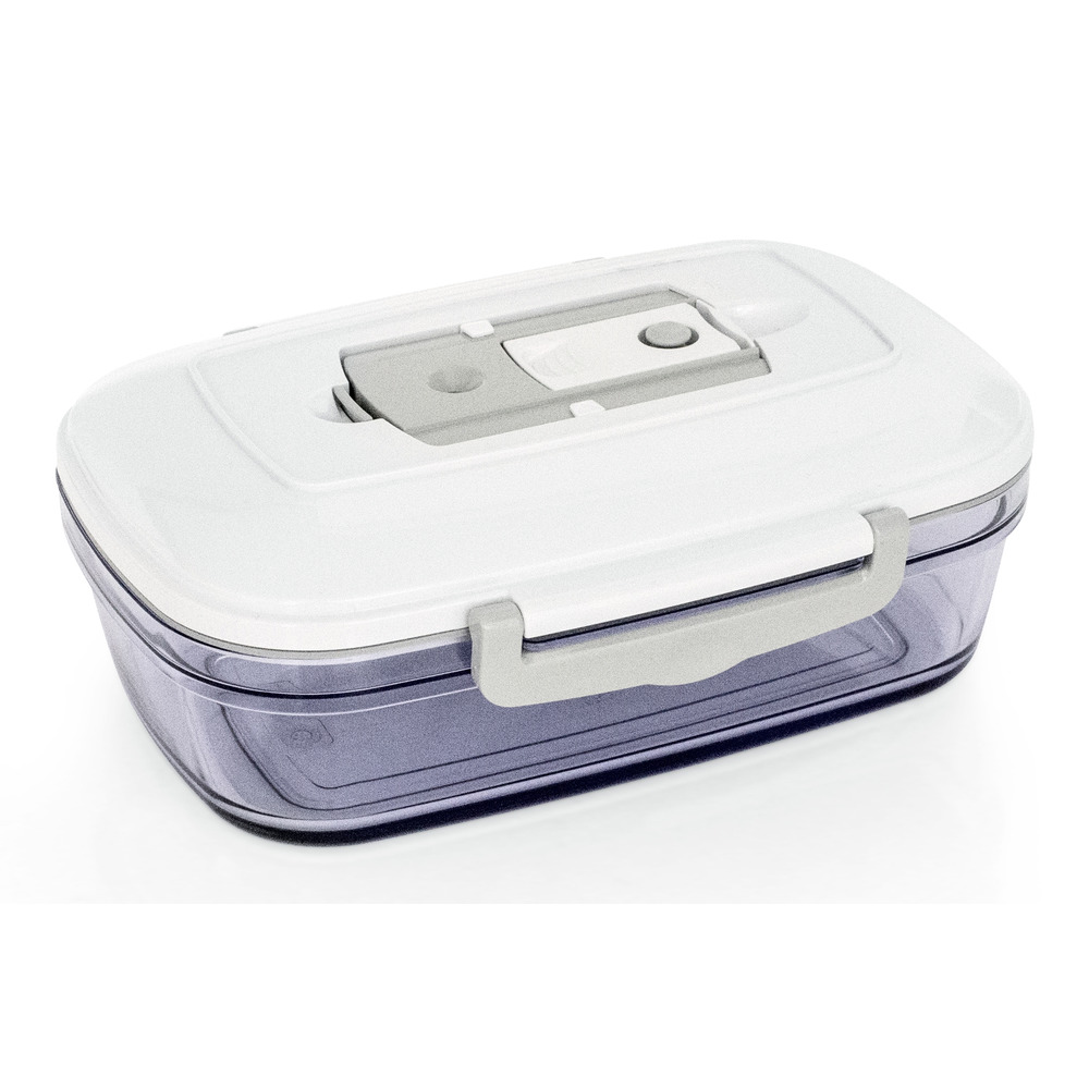 Die rechteckigen Vakuumierbehälter mit weißem Deckel und Verschlussbügel verfügen über eine Vakuumanzeige und integrierte Datumsanzeige. Mithilfe des bei der Vakuumverpackungsmaschine VAC585 mitgelieferten Zubehörschlauches kann dem Behälter ganz einfach der Sauerstoff entzogen werden. Die Behälter eignen sich hervorragend zum Aufbewahren von Wurst oder Gemüse unter Vakuum im Kühlschrank. Diese Aufbewahrungsbehälter sind selbstverständlich auch Tiefkühltruhen geeignet bis -18°C und können ohne Deckel auch zum Auftauen im Backofen (max. 90°C) oder in der Mikrowelle verwendet werden.(Lieferung ohne Absaug-Schlauch / Dieser ist beim Vakuumierer 131489 im Lieferumfang enthalten oder kann separat bestellt werden.)