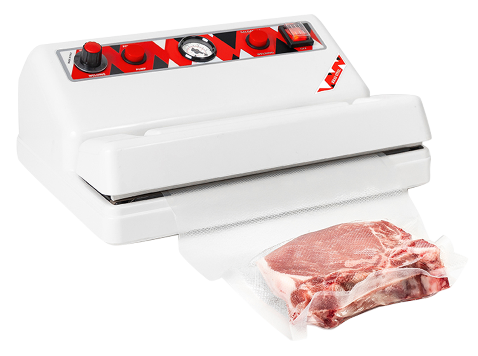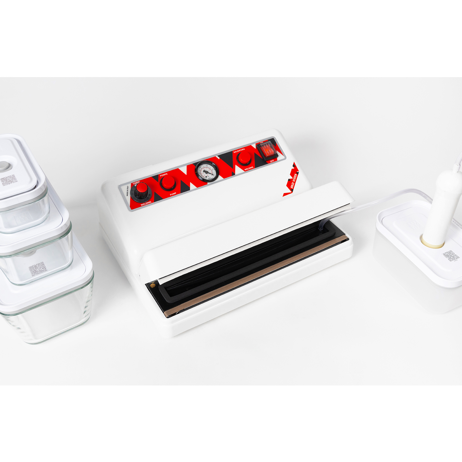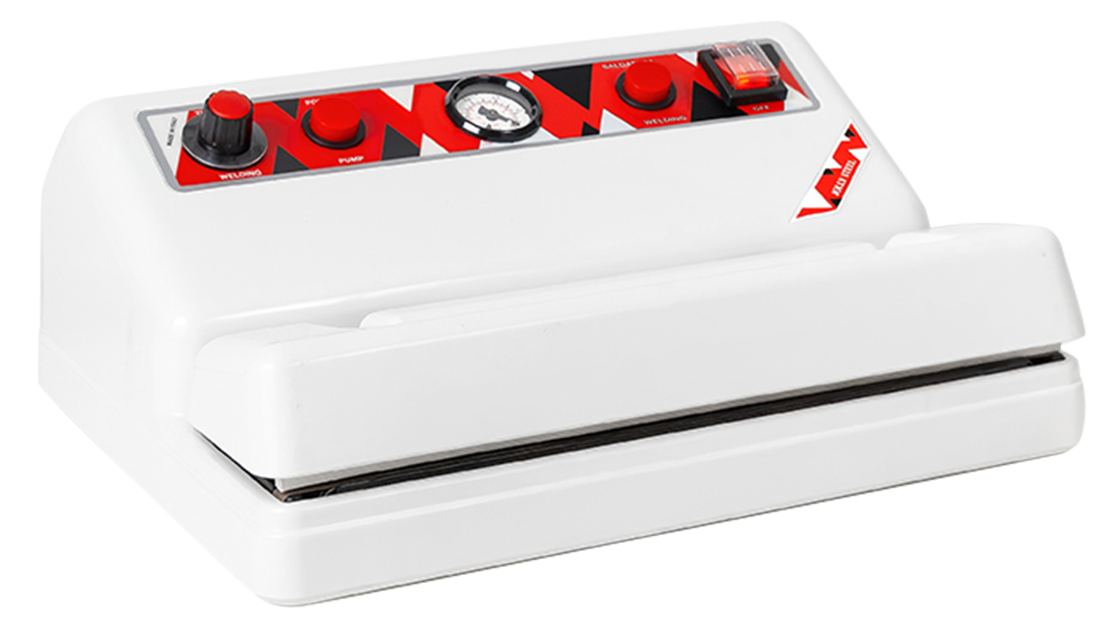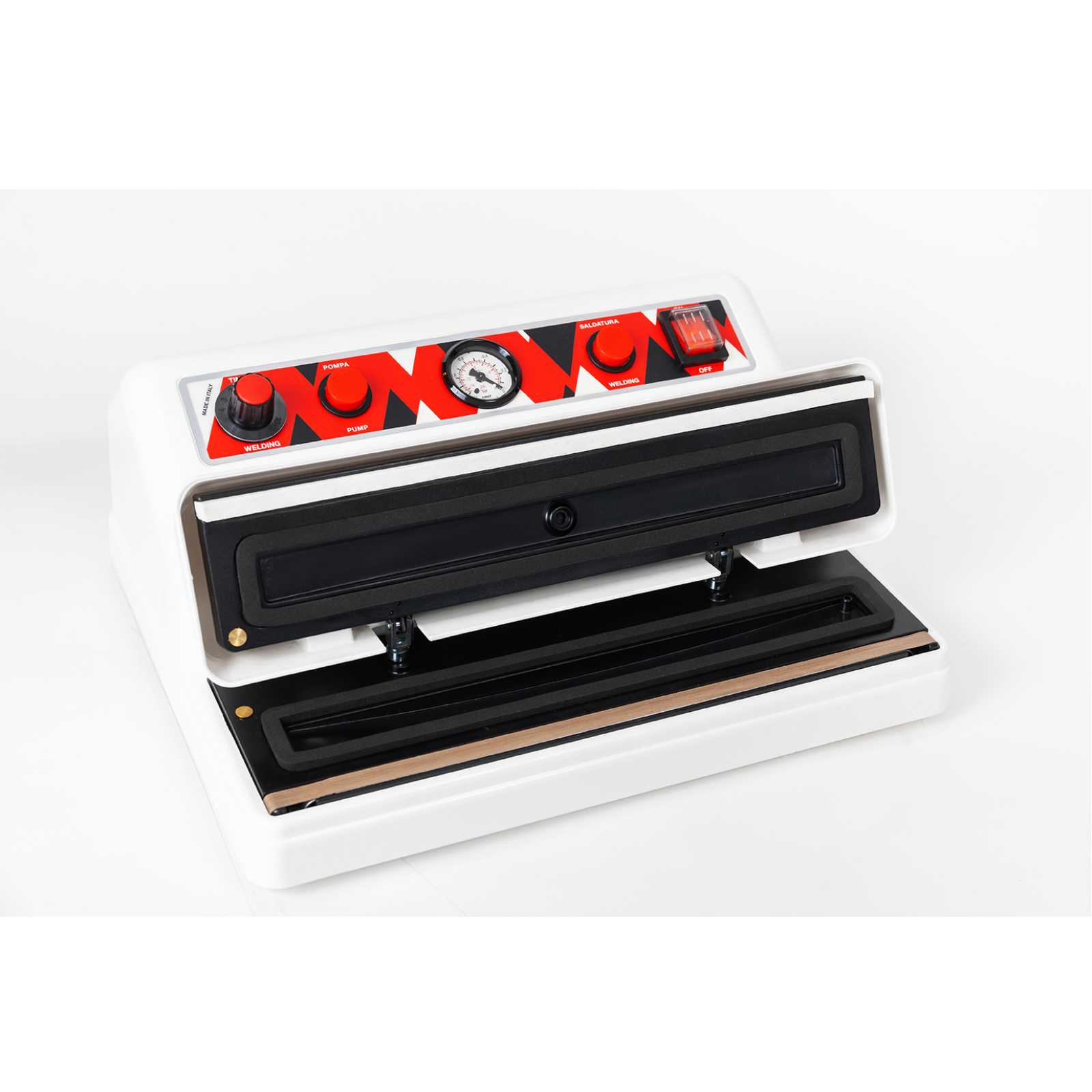 Ausstattung: Hauptschalter, Pumpentaste, Vakuummeter, Schweißtaste, Schweißtimer und Hochleistungs-Kolbenpumpe. Schlauchanschluss und Sensor, der es ermöglicht Vakuumier Behälter zu verwenden, ohne das die Maschine schweißt.