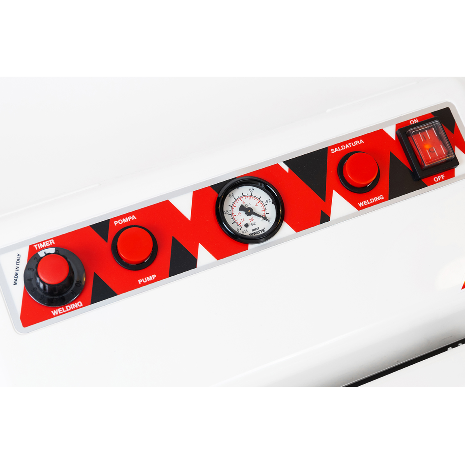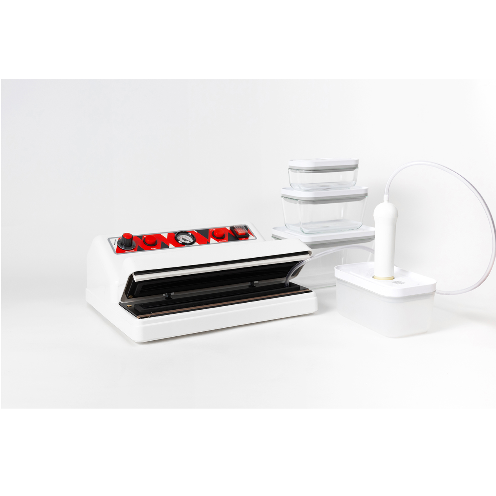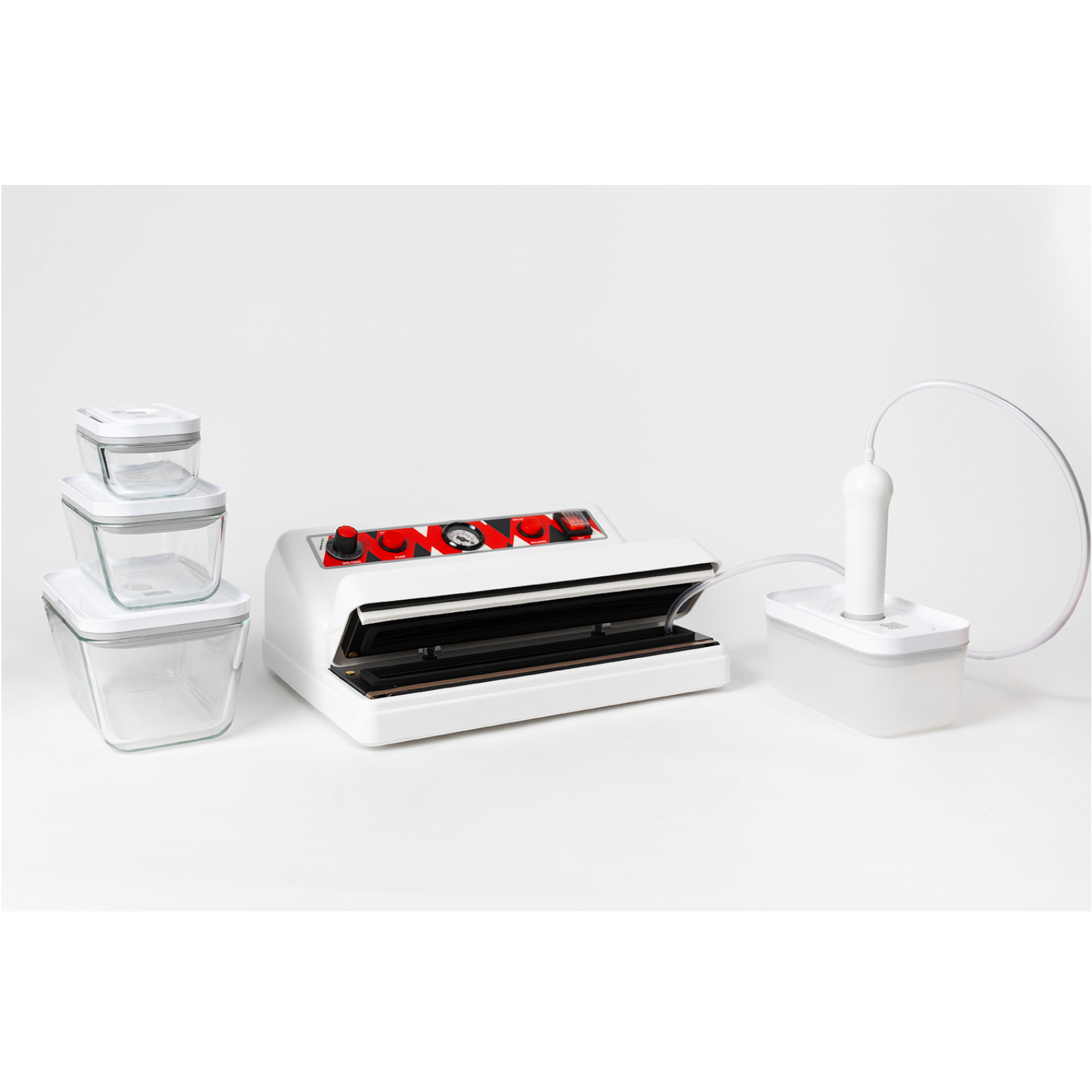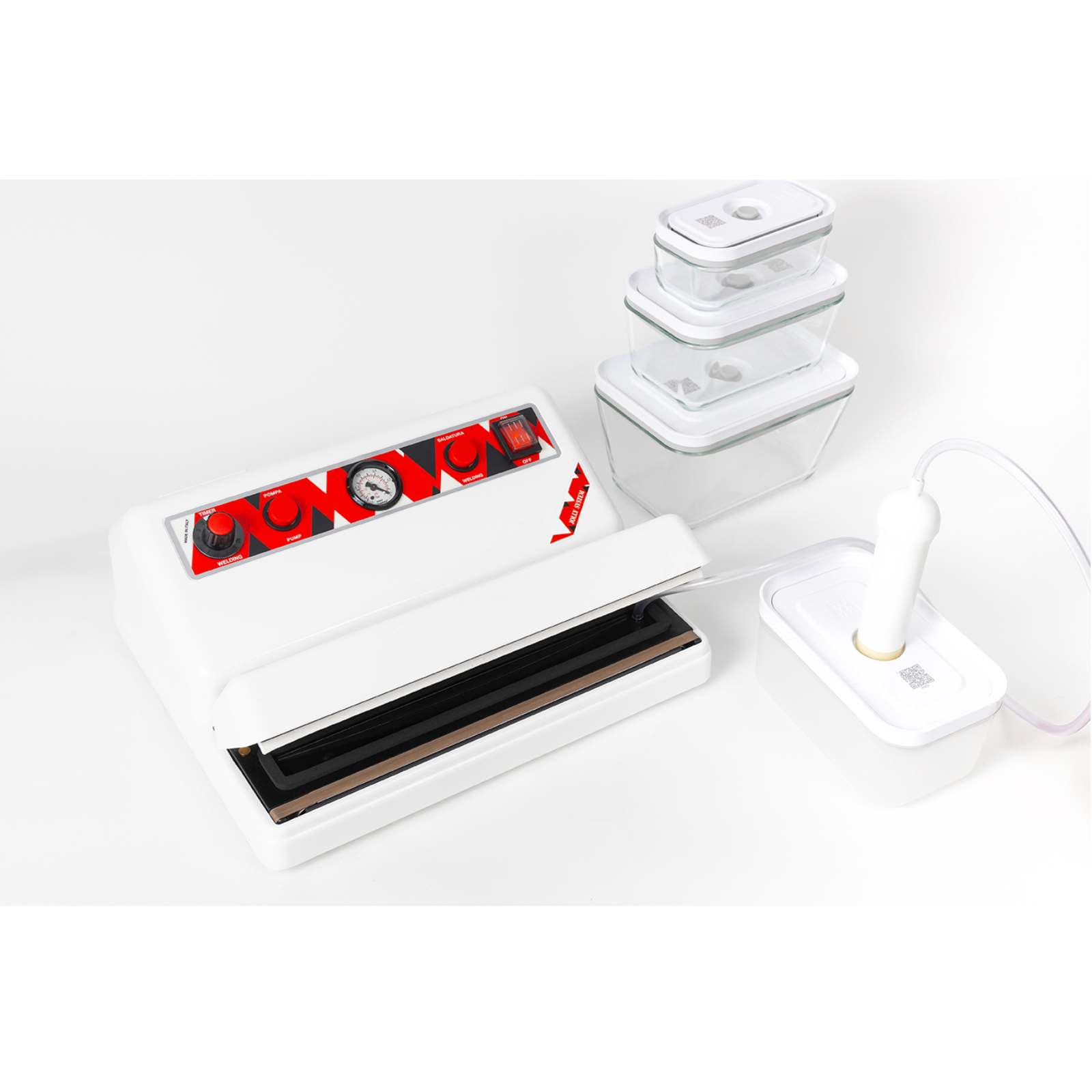 Ausstattung: Hauptschalter, Pumpentaste, Vakuummeter, Schweißtaste, Schweißtimer und Hochleistungs-Kolbenpumpe. Schlauchanschluss und Sensor, der es ermöglicht Vakuumier Behälter zu verwenden, ohne das die Maschine schweißt.