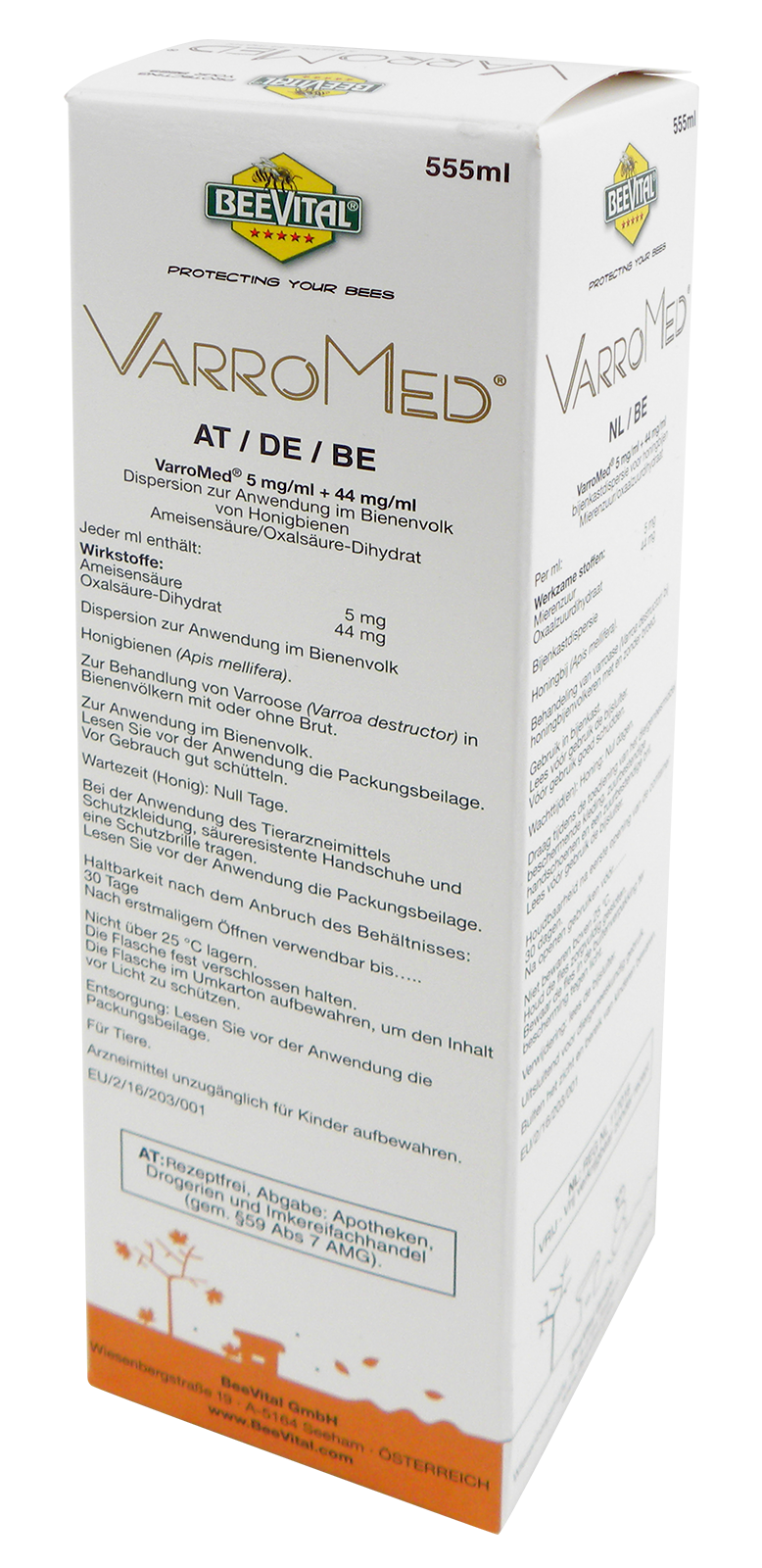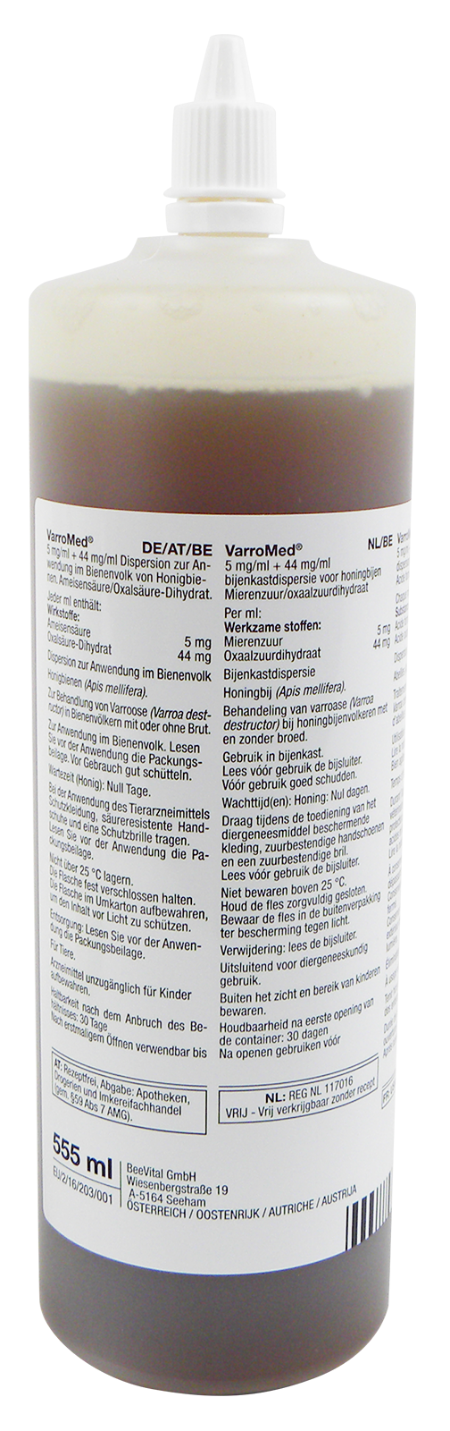 VarroMed® ist eine gebrauchsfertige Lösung, die zur ganzjährigen Varroabehandlung zugelassen ist. Es handelt sich um eine Kombination von Oxal- und Ameisensäure in Verbindung mit Propolistinktur und verschiedenen ätherischen Ölen. Besonders einfache und schnelle Anwendung im Bienenstock, ohne dass Vorbereitungen getroffen werden müssen. Mindesthaltbarkeit dieser Charge: 11/2025