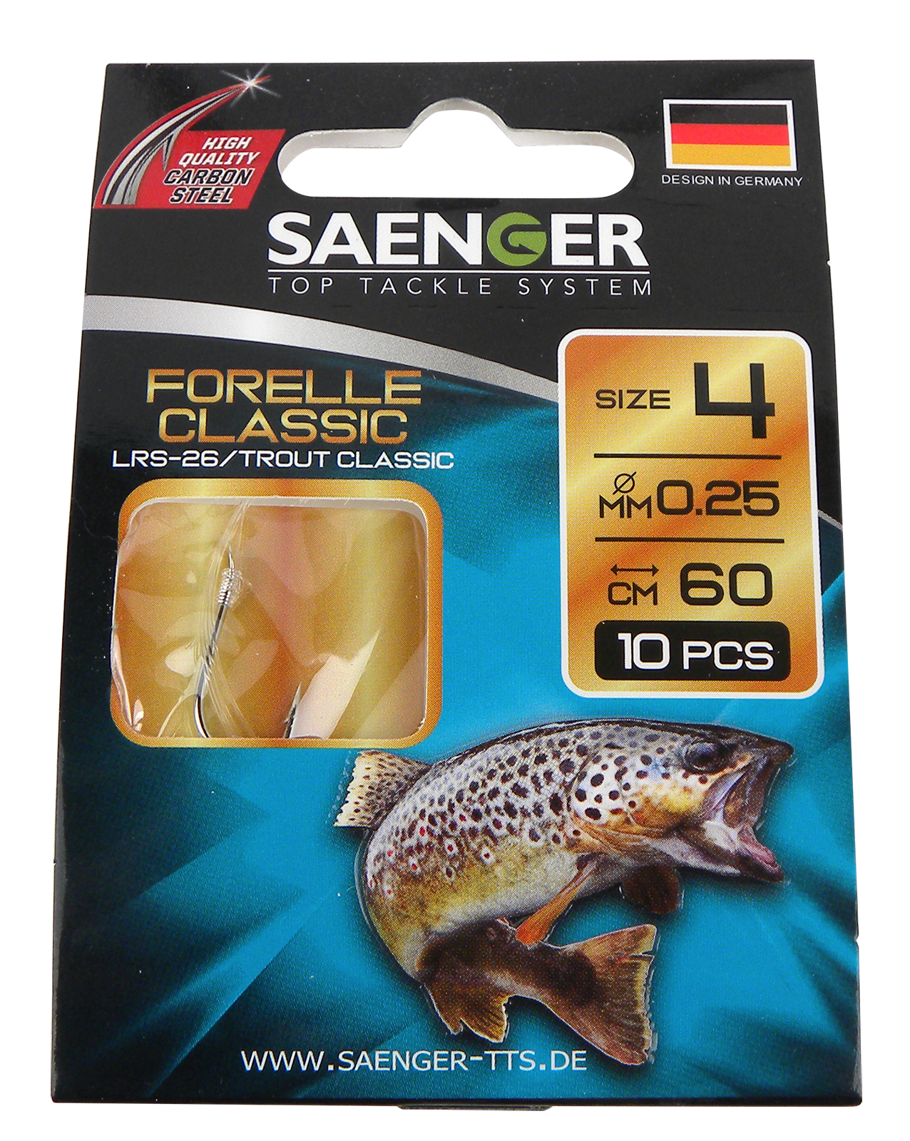 Dieses Fertigvorfach mit Hakengröße 4 und einer Schnurstärke von 0,25 mm ist ideal für das Forellenangeln mit kräftigen Ködern wie Bienenmaden, Würmern oder Teig.
