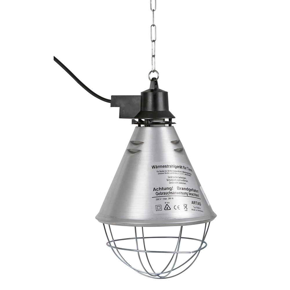 Infrarotlampe mit Alu-Schirm ø 21 cm, mit 6 Lüftungsschlitzen für bessere Luftzirkulation, dadurch längere Lebensdauer der Infrarot-Lampe. Befestigungskette (max. 20 kg Tragkraft). Max. 175 W Leuchtmittel! Lieferung ohne Glühlampe!