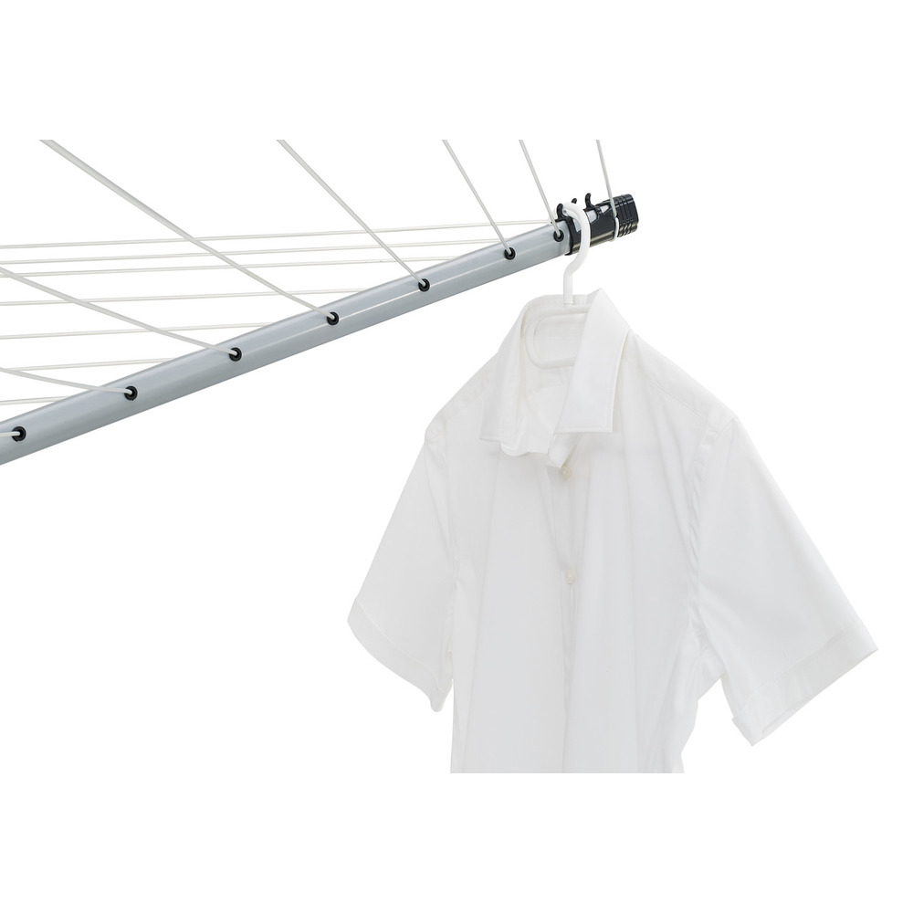Besonders stabil dank massivem Standrohr und Stahltragarmen. Mit 50 Metern Leinenlänge, die Platz bieten für bis 5 Waschmaschinenfüllungen. Für mehr Arbeitskomfort individuelle Einstellung der Leinenhöhe von 135 bis 180cm. Mit 12 Kleiderbügelhalter für das faltenfreie Trocknen von Hemden und Blusen. Inklusive Schutzhülle und Bodenhülse.