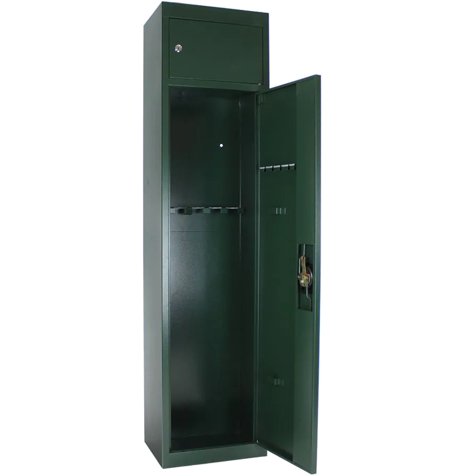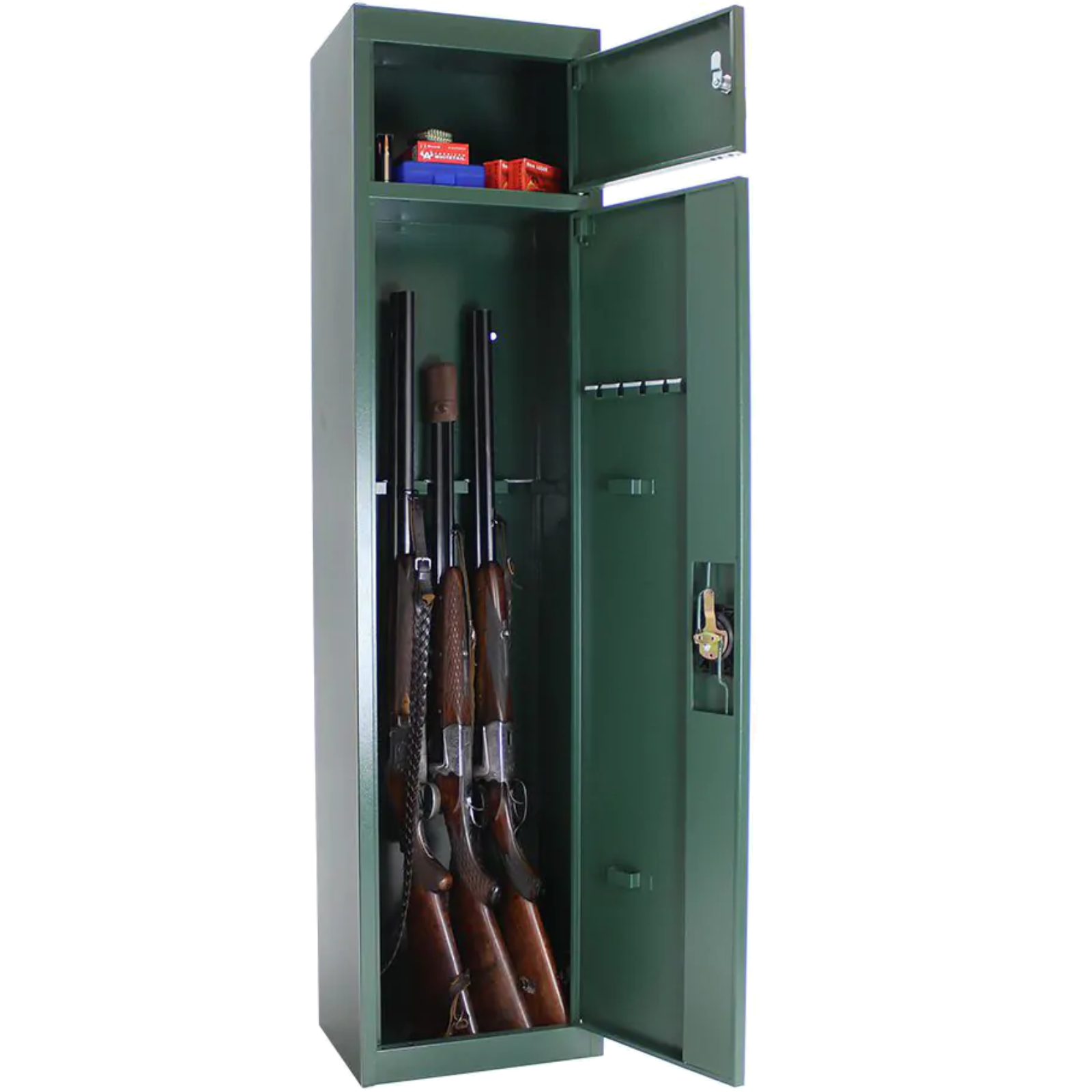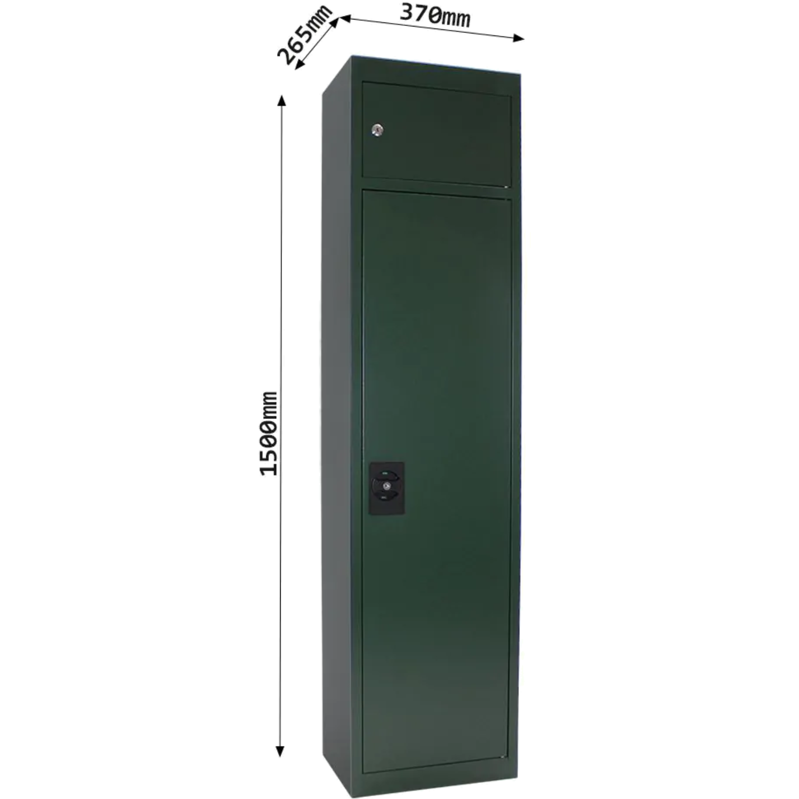 Der Rottner Gun 5 Cargo ist ein einfacher Waffen- und Munitionsschrank, in dem Sie bis zu 5 Langwaffen verwahren können.Der Schrank ist aus hochwertigem Stahlblech hergestellt und verfügt über zwei versperrbare Fächer, eines für die Waffen und eines für Munition bzw. Zubehör.Jedes Fach besitzt ein Zylinderschloss inkl. 2 Schlüssel.Für die fachgerechte Montage verwenden Sie bitte das inkludierte Montagematerial.Sicherheitsklasse:Einbruchsicherheit nicht zertifiziert - in Deutschland nur als Munitionsschrank verwendbar!Verschluss:2 Zylinderschlösser mit jeweils 2 SchlüsselSicherheitsmerkmale:einwandiger Waffenschrank aus hochwertigem Stahlblech2 separate Fächer für 5 Langwaffen und MunitionMax. Waffenhöhe 1245 mmPutzstockhalterung auf der Türinnenseite, WaffenhalterungenFeuerfalz in TüröffnungInnenliegende Scharniere - 90° TüröffnungswinkelAußentiefe +15 mm durch aufgesetzten BeschlagMontage:Eine einfache Befestigung am Boden oder an der Wand ist möglich2 Boden- und 2 Rückwandbohrungen durchgebohrt, Ø 11 mmMontagematerial wird GRATIS mitgeliefertKLASSIFIZIERUNGVersicherungswert privat AT: Nach Absprache mit der VersicherungVersicherungswert gewerblich AT: Nach Absprache mit der VersicherungSicherheitsstufe Detail: keine SicherheitsstufeANZAHL WAFFENPlatz für Langwaffen: 5Platz für Kurzwaffen: 0MAßEGewicht in kg: 17Innenmaße in mm (HxBxT): 1245 x 365 x 240Außenmaße in mm (HxBxT): 1500 x 370 x 265Volumen in Liter: 109Außenmaßerweiterung durch Beschlag: 15mmHöhe Türdurchgangslichte: 1170Breite Türdurchgangslichte: 290SCHLOSSSchlosstyp: Zylinderschloss mit 2 SchlüsselAUSSTATTUNGInnentresor serienmäßig: jaFachboden verstellbar: neinTüröffnungswinkel: max. 90° ÖffnungswinkelAnzahl Schubladen: 0BOHRUNGENAnzahl Rückwandbohrung: 2Rückwand Bohrung Durchmesser: 11Anzahl Bodenbohrung: 2Bodenbohrung Durchmesser: 11Rückwandbohrung: Ja, durchgebohrtBodenbohrung: Ja, durchgebohrt