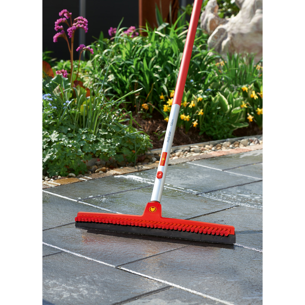 Der Wasserschieber eignet sich hervorragend, um mit der Schrubberleiste hartnäckigen Schmutz, z. B. von Terrassenoberflächen, zu entfernen. Die andere Seite verfügt über eine doppelte Gummilippe, mit der sich überschüssiges Wasser anschließend sprichwörtlich im Handumdrehen beseitigen lässt. Auch andere Flüssigkeiten sind natürlich schnell entfernt.