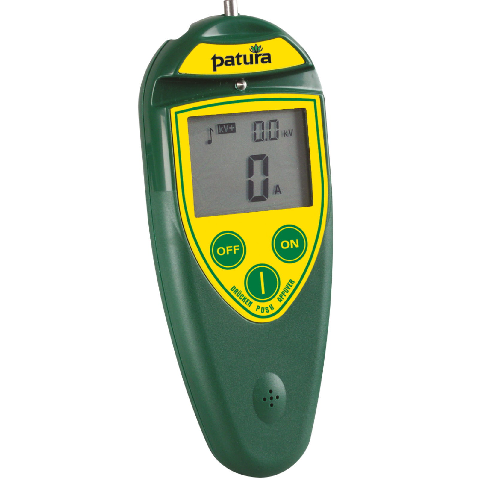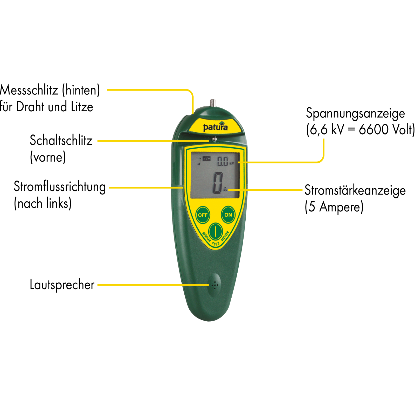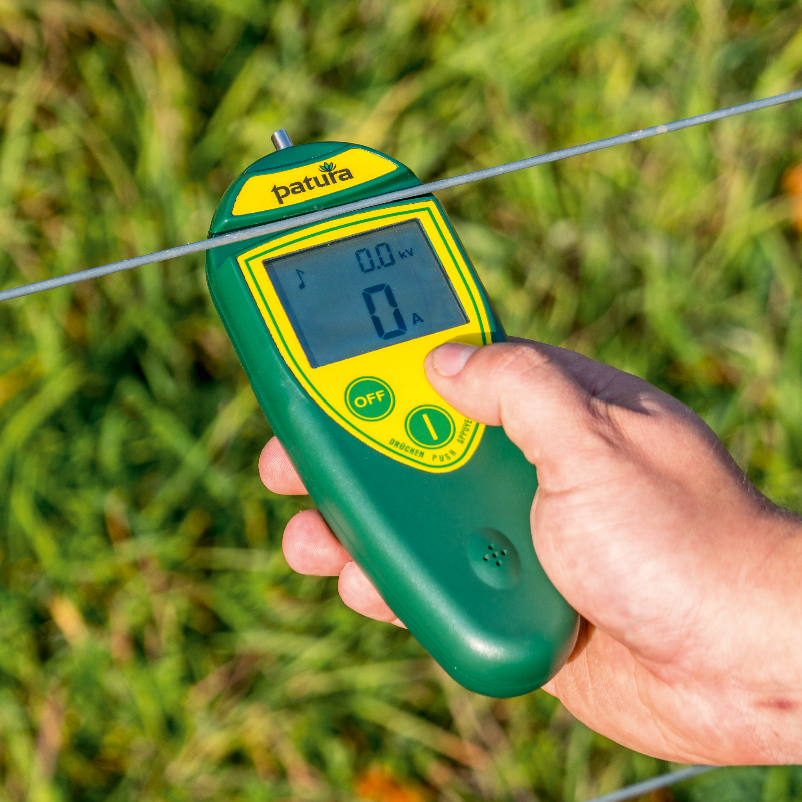Zur Fehlersuche wird die PATURA Fernbedienung auf den Zaundraht gedrückt und zeigt Spannung, Stromstärke und Stromflussrichtung (mittels Pfeil) an. Auf diese Weise lässt sich ein Kurzschluss schnell finden. Nach der Fehlerstelle geht die Stromstärke gegen 0 und der Richtungspfeil verschwindet. Die beleuchtete LCD-Anzeige erleichtert das Ablesen und ein akustisches Signal ertönt, sobald Spannung am Zaun messbar ist.