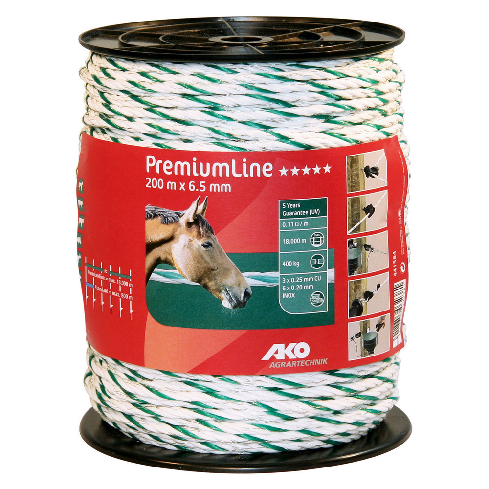 AKO PremiumLine Seil garantiert höchste Leitfähigkeit und höchste Hütesicherheit auch bei sehr langen Zäunen!Durch die Kupferleiter wird eine 40 x höhere Leitfähigkeit gegenüber herkömmlichen Leitermaterialien erreicht.Robuste Edelstahlleiter sorgen zusätzlich für sehr lange Haltbarkeit.Leiterbündelung - jeweils drei miteinander in Kontakt stehende Leiter sorgen für gleichbleibend hohe Spannung in Ihrer Anlage.Farbe: weiß/grün