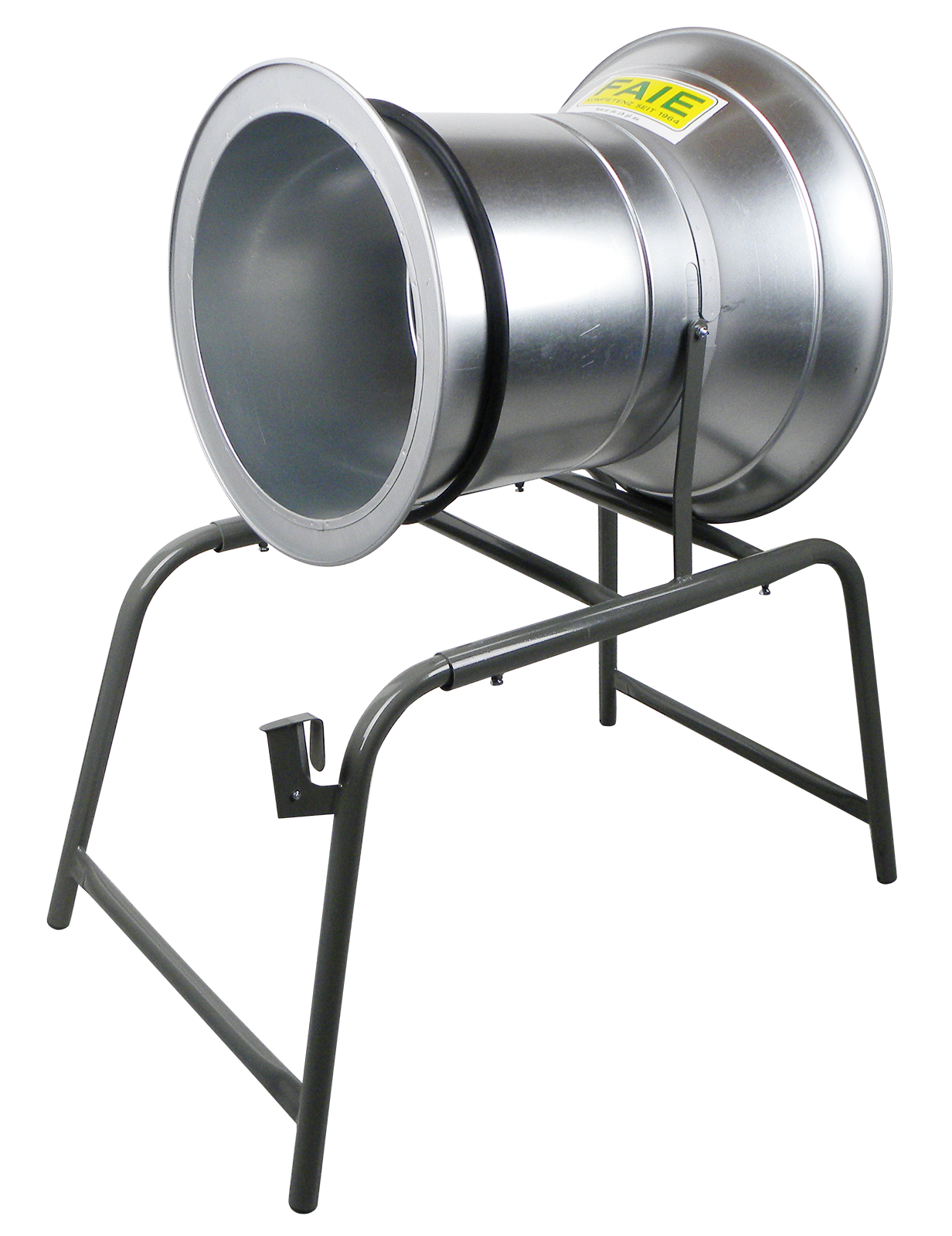 Ein robuster Verpackungstrichter mit praktischem Gestell aus Metall. 55 cm Rohrdurchmesser mit Einziehtrichter aus verzinktem Blech, vormontiert mit stabiler Konsole, Bremsgummi und Metall-Abstreifring (abnehmbar).