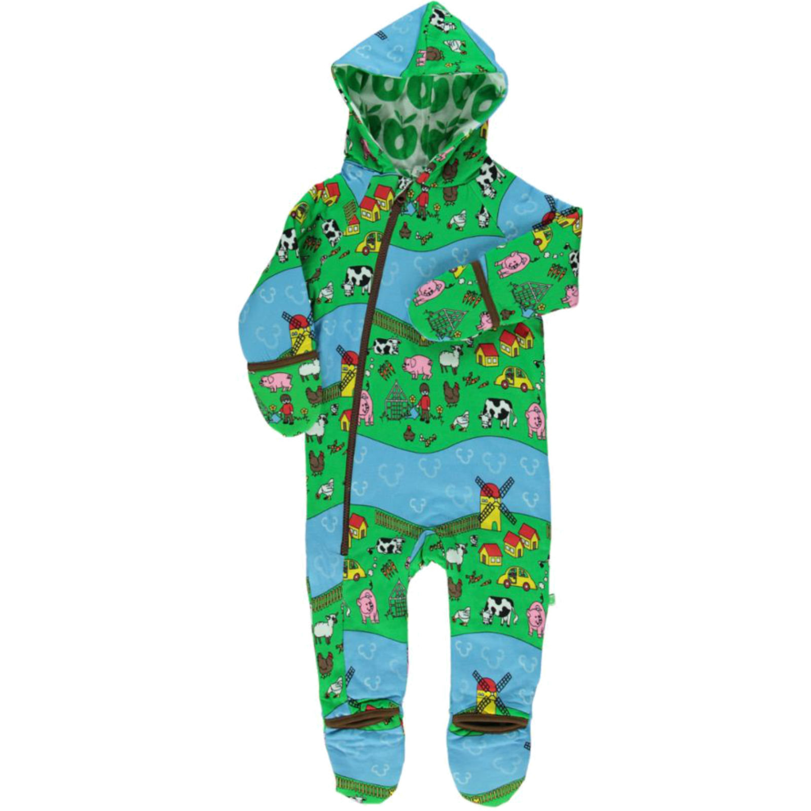 Gefütterter Anzug mit Kapuze aus 100% Bio Baumwolle und Elasthan. Auszuwählen zwischen 2 Designs da wendbar! Händchen und Füßchen klappbar!Wendbarer Anzug mit Bauernhof-Aufdruck. Småfolk ist eine dänische Marke, die Wert auf Qualität legt. Der Hosenanzug wurde in Dänemark entworfen und aus bester 100 % Bio-Baumwolle und Elasthan hergestellt, was das Kleidungsstück dehnbar und weich macht und gleichzeitig die Passform beibehält. So können die Kleinen der Familie in einer farbenfrohen und lebendigen Welt spielen, wachsen und ihre Fantasie erkunden während sie sich gleichzeitig frei bewegen können.