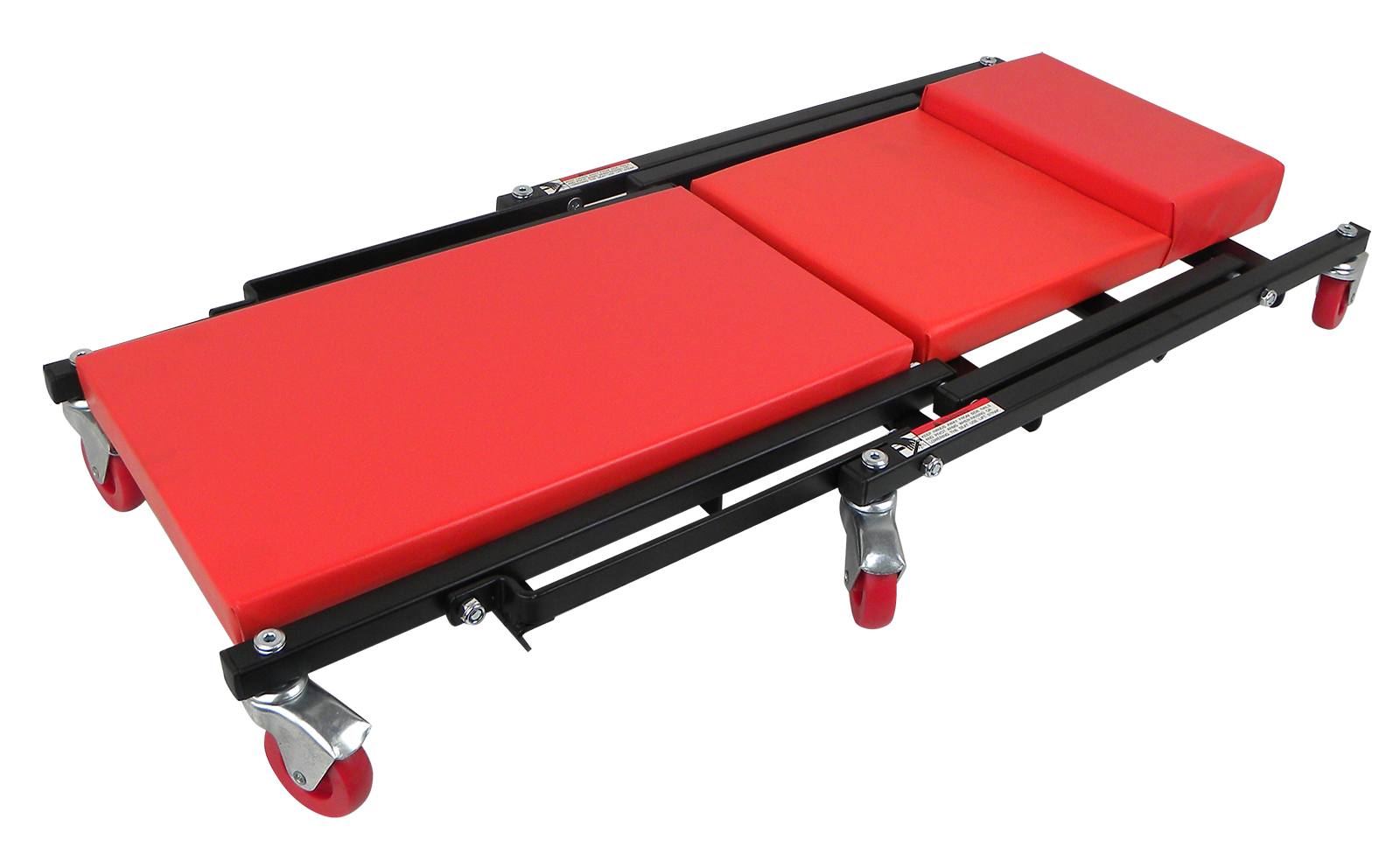 Praktischer Montagewagen mit gepolsterter Liegefläche 1030x415x160 mm. Leichtes Rollen durch 6 Laufräder. Mit einem Griff wird aus dem Liegewagen ein praktischer Arbeitshocker. Gewicht nur 11,8 kg.
