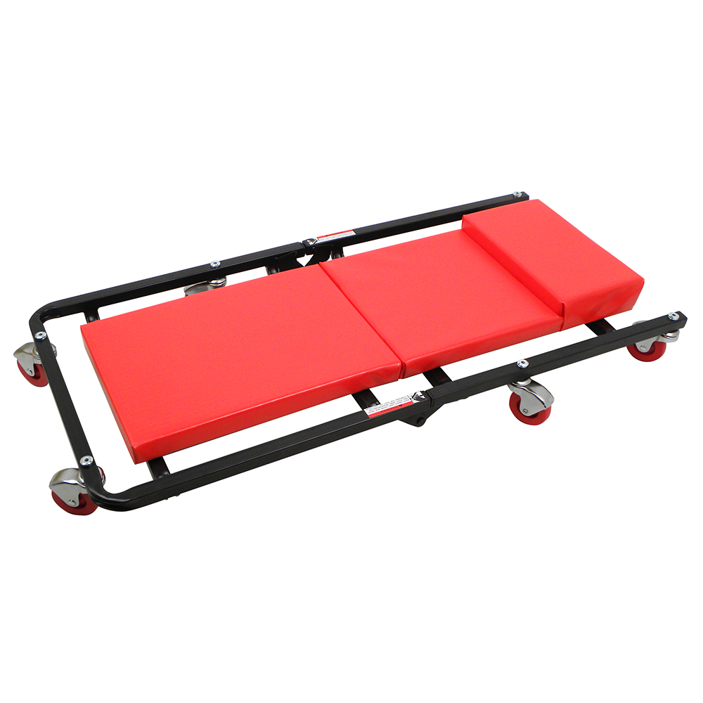 Komfortabler Liegewagen mit 6 Rollen. Gesamthöhe nur 13 cm, Liegefläche 82x28 cm. Durch die klappbare Ausführung wenig Platzbedarf. Maße geklappt: 45x43x15 cm. Aktionsmodell nur kurze Zeit verfügbar.