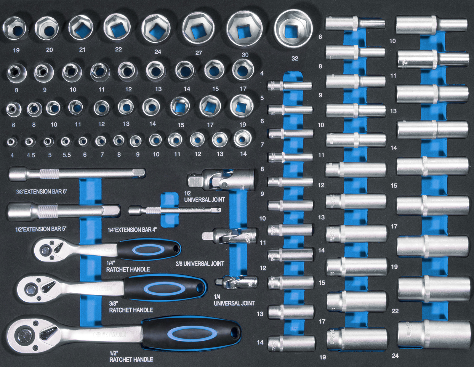 Universal Werkzeugwagen mit 7 kugelgelagerten Schubladen mit 100% Vollauszug. Große Räder für einfachen Transport. Einfaches verschließen durch Zentralverriegelung.Maße: 7780x460x980mm, Schubladen: 5x530x400x70mm, 2x530x400x145mm BxTxH. Tragfähigkeit p. Lade: 40kg.Komplett bestückt mit umfangreichen Werkzeugsatz in hochwertigen Einlagemodule für schnellen Zugriff und perfekte Ordnung in Ihrer Werkstatt.