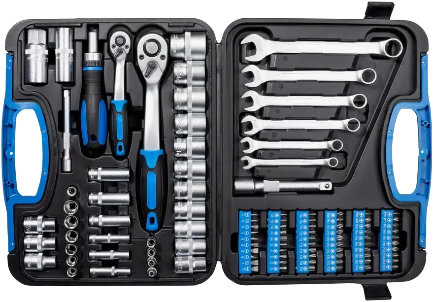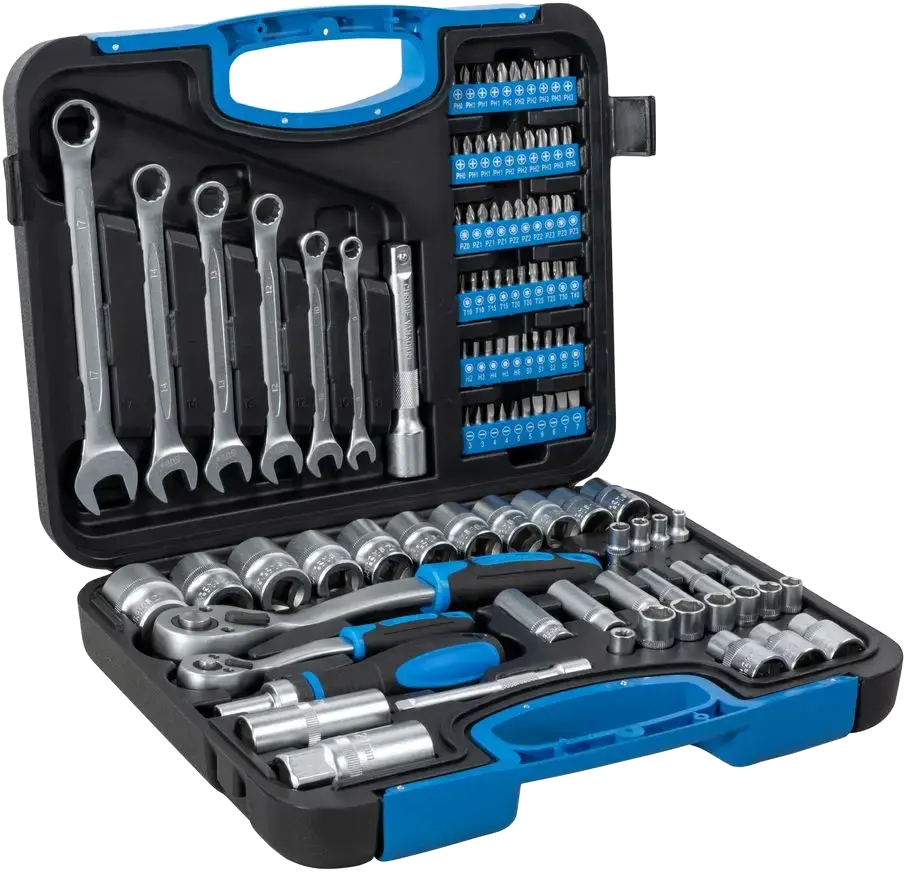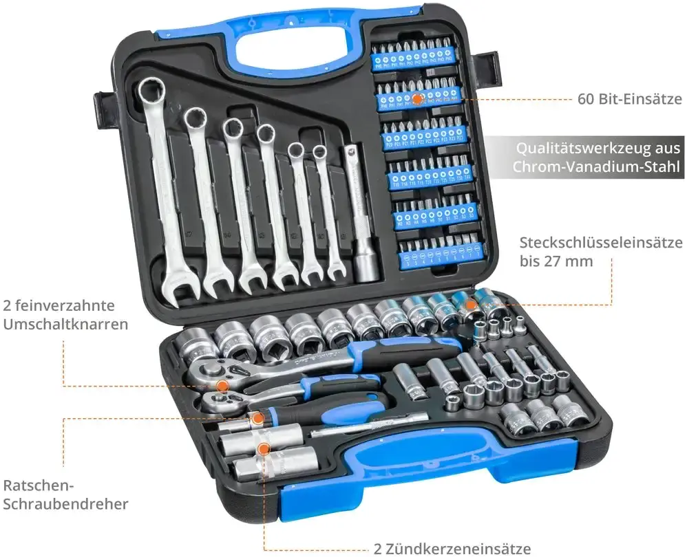 Dieses Werkzeug-Set im praktischen Koffer bestehend aus 104 Teilen aus Chrom-Vanadium-StahlEs umfasst 2 Ratschen (1/2 Zoll und 1/4 Zoll mit 72 Zähnen) mit passenden Steckschlüsseleinsätzen in kurz und lang, sowie entsprechende Verlängerungen.Ein großes Bitsortiment, Bit-Schraubendreher mit Ratschenfunktion, sowie alle nötigen Adapter und 6 Gabelringschlüssel machen dieses Set komplett.Inhalt: