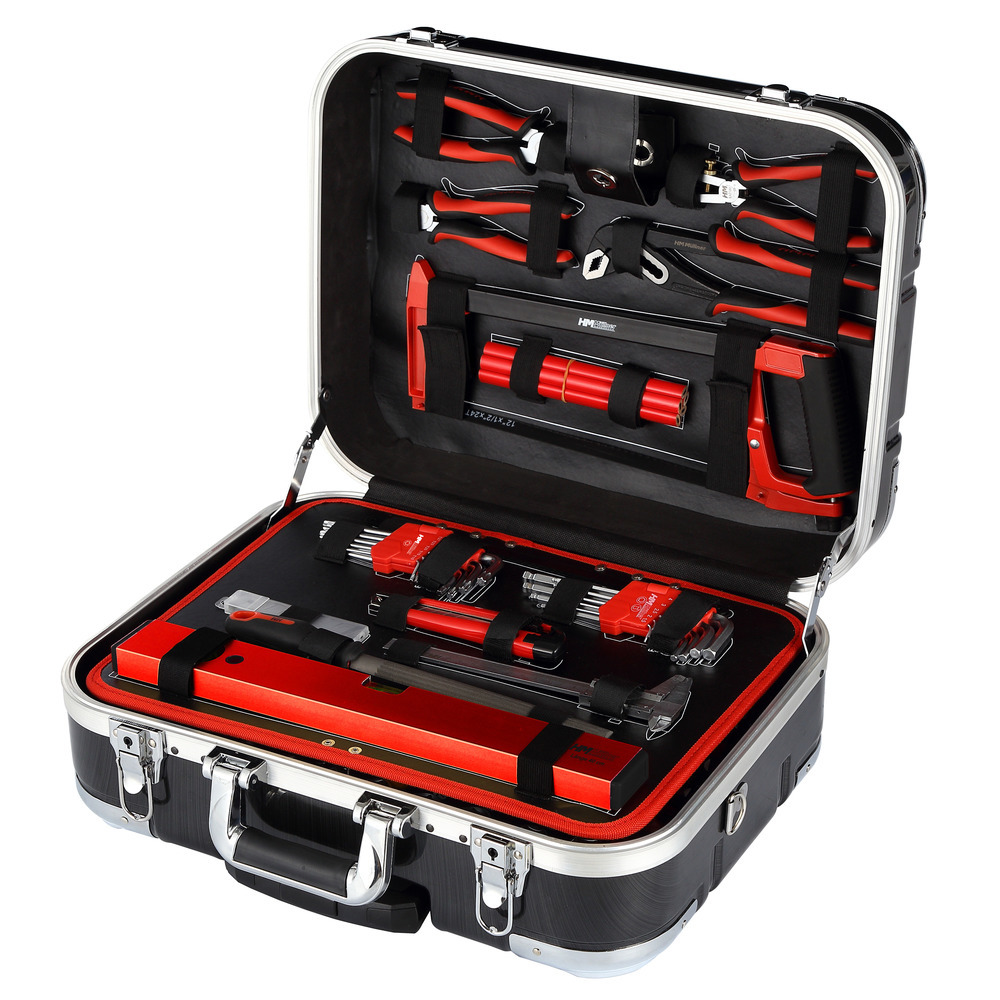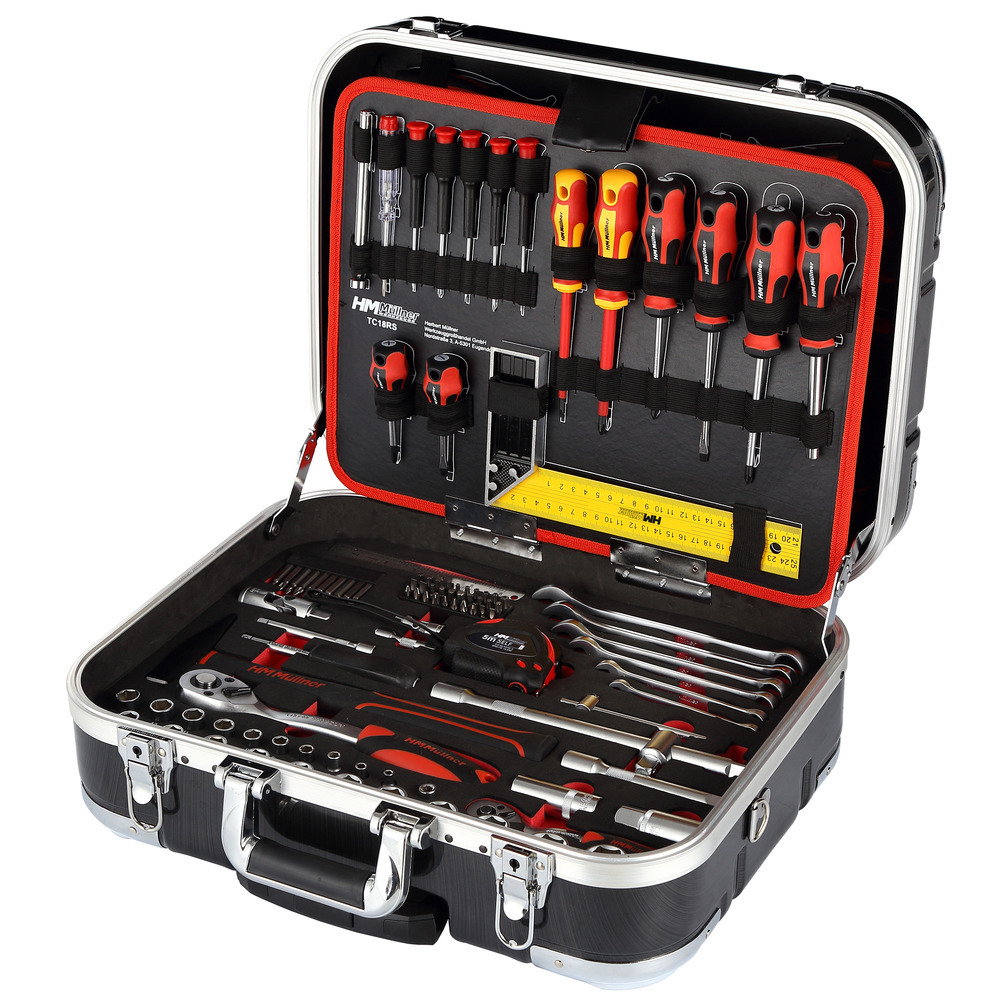 Der HM MÜLLNER Werkzeugkoffer 147-tlg ist ein umfangreich ausgestattetes Werkzeugset in bewährter Qualität, welches sich ideal für Handwerk, Haushalt und Hobby eignet. Dieser fahrbare Werkzeugkoffer mit dem praktischen “Trolley-System” bietet eine breite Auswahl an Werkzeugen für vielfältige Anwendungen.Technische Daten im Überblick:Bestückung: Der Werkzeugkoffer enthält eine Vielzahl von Werkzeugen, darunter Bits, Schraubendreher, Zangen, Schraubenschlüssel, Messwerkzeuge und mehr.Stahllineal 150 mm: Präzises Messen und Markieren.Bits aus S2-Stahl: Robuste und langlebige Bits für verschiedene Schraubanwendungen.Rollmeter 5 m: Einziehbares Maßband für genaue Längenmessungen.Ring-Gabelschlüssel 8-19 mm: Vielseitig einsetzbar für Muttern und Schrauben.Adapter, Verlängerungen, Universalgelenke: Flexibilität beim Arbeiten mit Steckschlüsseln.Drehgriff mit 1/4 Zoll-Vierkantaufnahme: Komfortable Handhabung von Steckschlüssel-Einsätzen.Schlosserhammer 300 g: Zum präzisen Einschlagen von Nägeln und Bolzen.Umschaltknarre 1/4 Zoll und 1/2 Zoll: Schnelles Wechseln der Steckschlüssel-Einsätze.Sechskanteinsätze 4-13 mm und 10-24 mm: Für verschiedene Schraubarbeiten.Teleskopmagnet: Zum Aufheben von Metallteilen.Spannungsprüfer 140 mm: Sicherheitsprüfung von elektrischen Leitungen.Präzisions-Schraubendreher: PH-/FL-/PZ-Schraubendreher für feine Arbeiten.VDE-Schraubendreher: Für Arbeiten an elektrischen Anlagen.Stahlwinkel 250 mm: Präzises Anzeichnen und Messen.Stiftschlüssel (TX und Sechskant): Für Montage- und Demontagearbeiten.Cuttermesser 18 mm: Mit Ersatzklingen für präzise Schnitte.Schiebelehre 150 mm: Messung von Innen- und Außendurchmessern.Werkstattfeile 200 mm, halbrund: Zum Entgraten und Glätten von Oberflächen.Wasserwaage 400 mm: Genauigkeit bei der Ausrichtung.Kombizange, Abisolierzange, Seitenschneider, Wasserpumpenzange: Verschiedene Zangen für unterschiedliche Aufgaben.Metallsäge 300 mm mit Ersatzblättern: Zum Schneiden von Metall.Knieschutz-Matte: Komfort beim Arbeiten auf harten Oberflächen.Alu-Kunststoffkoffer absperrbar mit integriertem, ausziehbarem Griff und Laufrollen: Einfacher Transport und sichere Aufbewahrung.