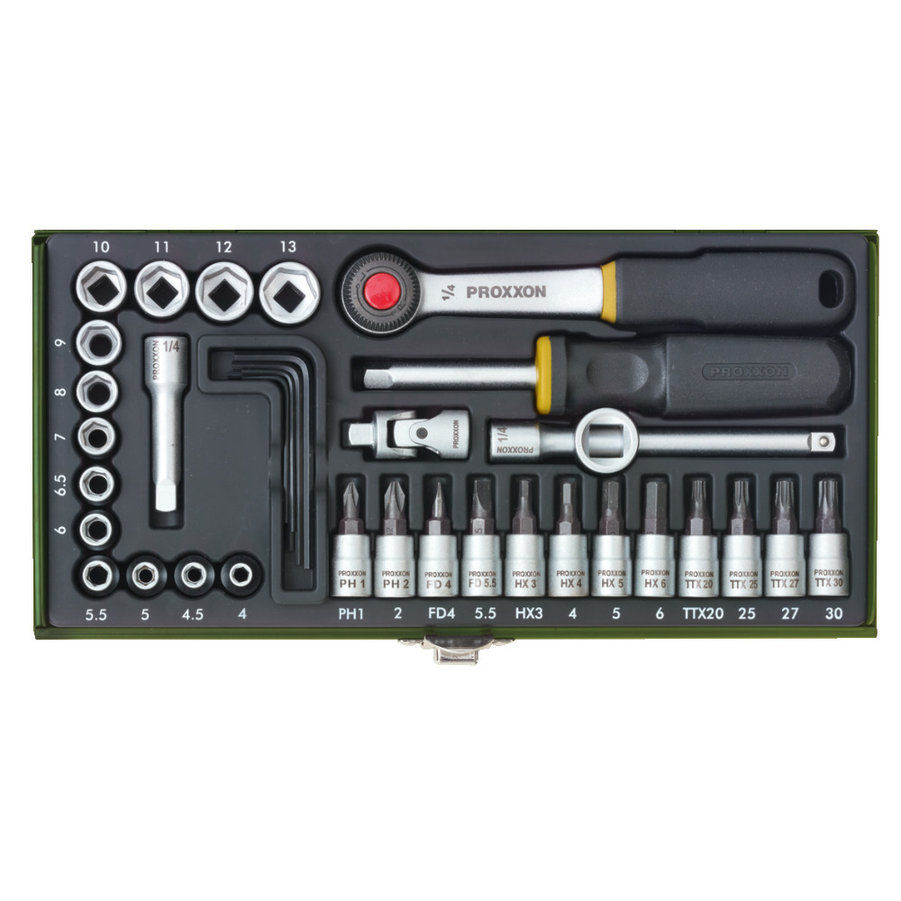 36-tlg. Feinmechanikersatz, Stecknüsse 4-13 mm, Schraubereinsätze usw. Ideal für Haus, Hobby und Werkstatt. In Stahlkassette.