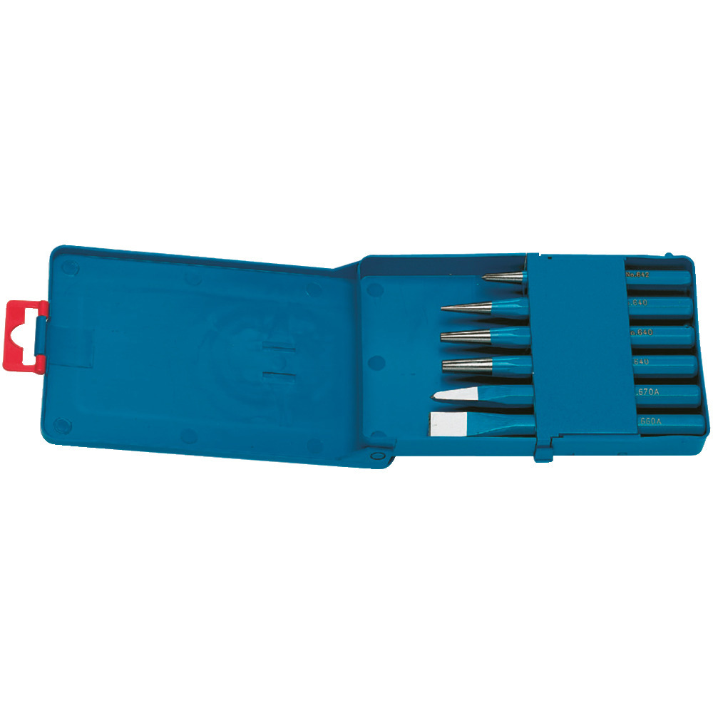Inhalt: Durchtreiber 2, 4,6 mm, Körner, je 1 Flach-, Spitzmeissel 125 mm.