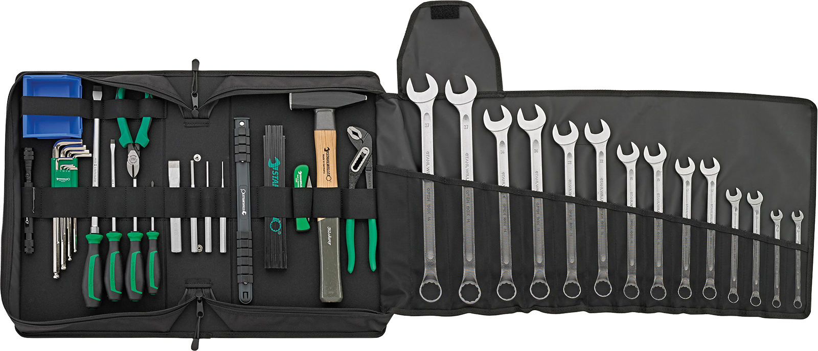 Hochwertiger Werkzeugsatz für den harten Einsatz in der Landwirtschaft oder im Baugewerbe. Die optimale Zusammenstellung bieten Ihnen genau das richtige Werkzeug bei sehr geringen Platzbedarf. Die robuste Tasche mit nur 445x270x110 mm BxLxH kann platzsparend, z.B. hinter dem Fahrersitz oder im Werkzeugfach aufbewahrt werden.Zusammenstellung:Ringmaulschlüssel extralang 10 - 27m m je 2 Stk,Schraubendrehersatz,Splintentreiber und Flachmeißel,Hammer 800 g,Wapu-Zange 240 mm,Kabelmesser, Seitenschneider, Gliedermaßstab und LED Taschenlampe mit Magnet.Alles in hochwertiger Stahlwille Qualität.