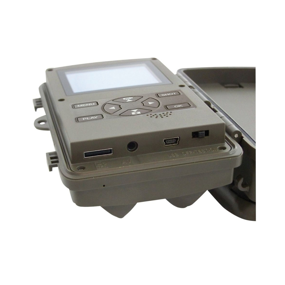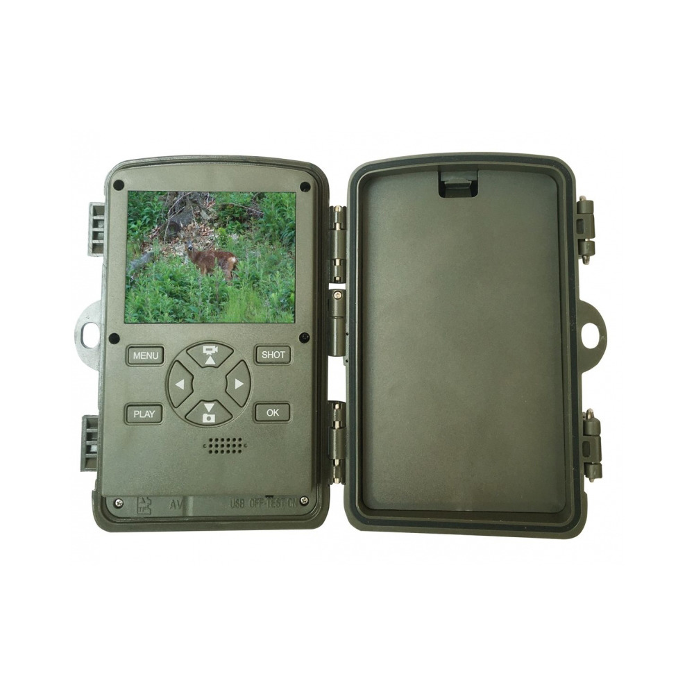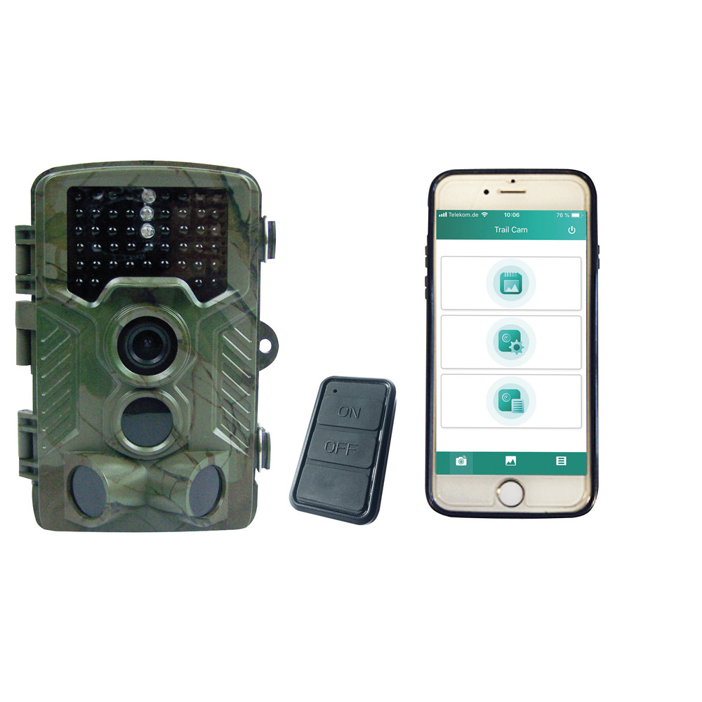 Neue Überwachungskamera mit Nahfeld Wifi Funktion per Fernbedienung - einfach das Smartphone über Fernbedienung mit der Kamera verbinden und die Bilder auf das Smartphone downloaden ohne lästiges Klettern oder SD-Kartentausch. Umfangreiche Einstellmöglichkeiten für perfekte Bilder und Videos bei Tag und bei Nacht Kamera mit 20 Mega-Pixel (kleinere Auflösungen einstellbar) und 2,4″ TFT Bildschirm. Bilder und Videos, bei Tag in Farbe und in der Nacht in schwarz/weiß, durch 2 high Power 940 nm Black-LED's, dadurch kein verschrecktes Wild, Blitzreichweite ca. 20 m, einfach an der Kirrung oder am Wechsel anbringen. 24-Stunden rund um die Uhr Bilder und Videos. Technische Daten: Trigger Time nur 0,3 Sekunden (bei 4 GB Micro SD Karte), Objektivbrennweite 3,3; 105 Objektiv. Automatischer Weißabgleich, Kartenschacht für Micro SD Karten bis 128 GB! (nicht im Lieferumfang), 1, 2, 3, 6 oder 10 Bilder oder 1 Bild + Video pro Auslösung einstellbar (Videolänge 3 Sek. bis 10 Min. wählbar). Videos mit Tonaufnahme von 3840 x 2160 / 10 fps, 2688 x 1520 / 20 fps, 1920 x 1080 / 30 fps, 1280 x 720 / 60 fps, 720 x 480 / 30 fps, 640 x 480 / 30 fps, 320 x 240 / 30 fps einstellbar. Datum, Uhrzeit, Mondphase, auf jedem Bild. Timer-Einstellung möglich. 3 Stück PIR Bewegungsmelder (Intensität einstellbar) davon 2 Vor-PIR's mit 120° Registrierungswinkel für quer verlaufende Wechsel, können auch ausgeschaltet werden, Haupt-PIR mit 60° Registrierungswinkel, Playback Zoom 1 bis 14 fach, Diashowfunktion in der Bildauswahl, Passwortschutz, Betrieb je nach standby Zeit über 4 bis 8 Stück Alkali Mignon Batterien (AA, nicht im Lieferumfang) wetterfestes Gehäuse IP54, USB Kabel für Anschluß zur Bildübertragung auf Ihren PC, Gurtband für Baumbefestigung und Wandmontagehalterung. extrem kleine Maße ca. L x B x H = 130 x 90 x 75 mm inkl. Batteriebox, mehrsprachige Menuführung D, GB, DK, FI, S, F, E, I, P, NL