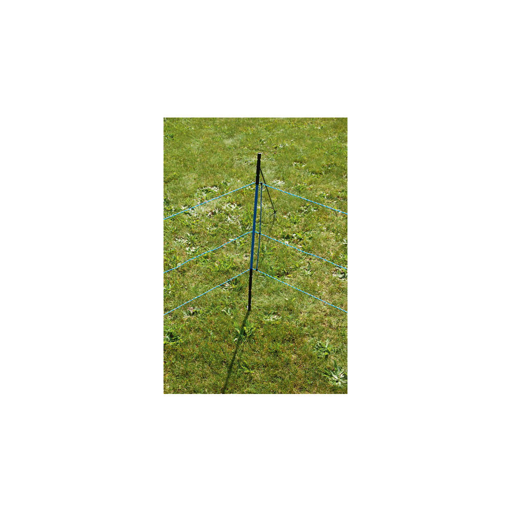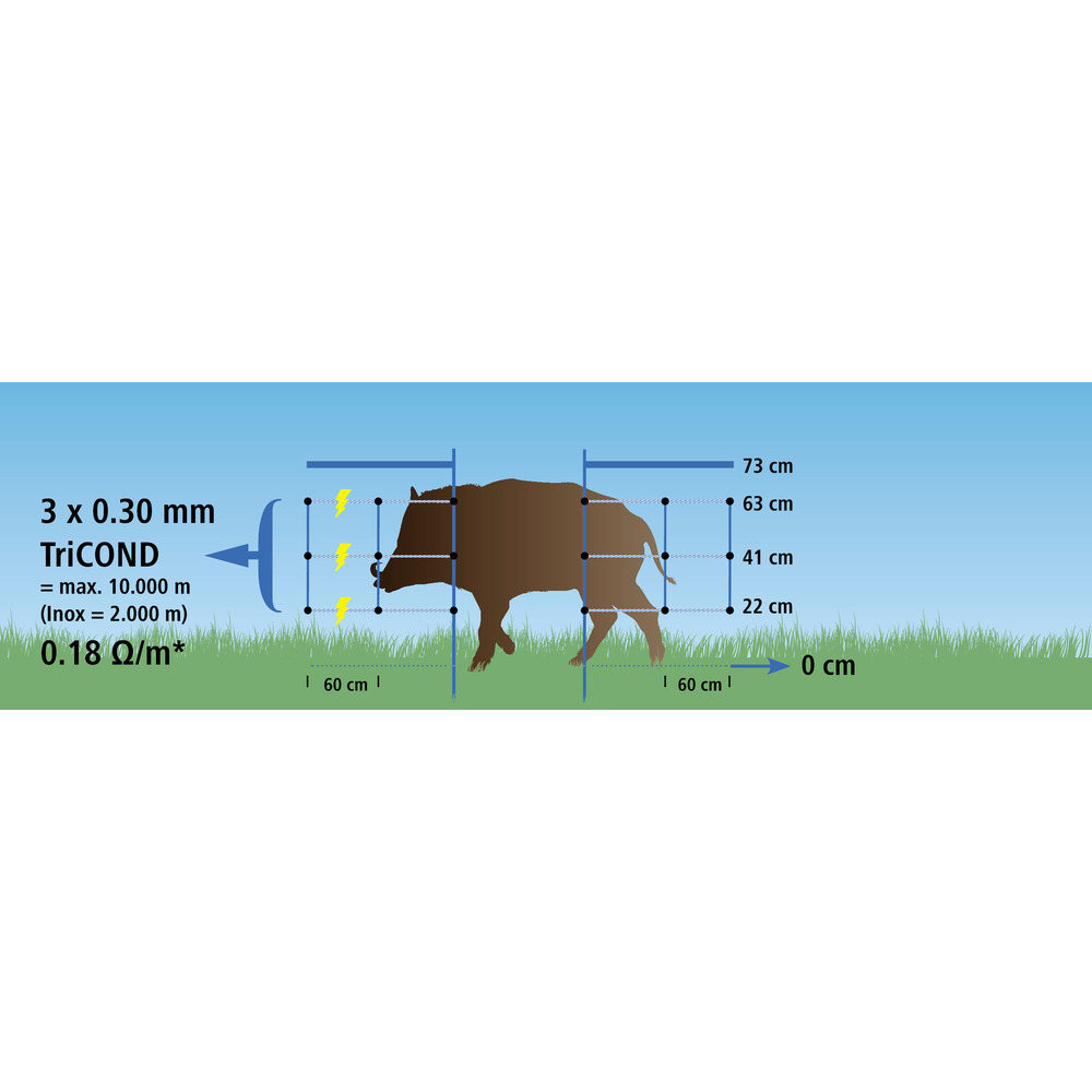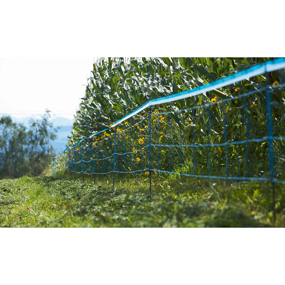 Die unkomplizierte Lösung zur Wildabwehr! Klare Vorteile gegenüber herkömmlichen Elektrozäunen: Schneller Auf- und Abbau, Bodenabstand besser zum Ausmähen als herkömmliche Elektronetze, Netze lassen sich einfach miteinander verbinden (Verbinder im Lieferumfang enthalten!).Inkl. 3 TriCOND Leiter (5x höhere Leitfähigkeit als Edelstahlleiter!), Länge 50 m, Höhe ca. 63 cm, mit 12 blauen Fiberglaspfählen mit ca. 4,5 m Pfahlabstand. Inkl. Zubehör (Verbinderhülsen, 3 Bodenanker, Nylonschnur zum Abspannen, Reparaturlitzen und Warnschild).Kann in Verbindung mit 25mm blauem Signalband verwendet werden (nicht im Lieferumfang enthalten: Best.Nr. 109894) - zur besseren optischen Unterstützung!