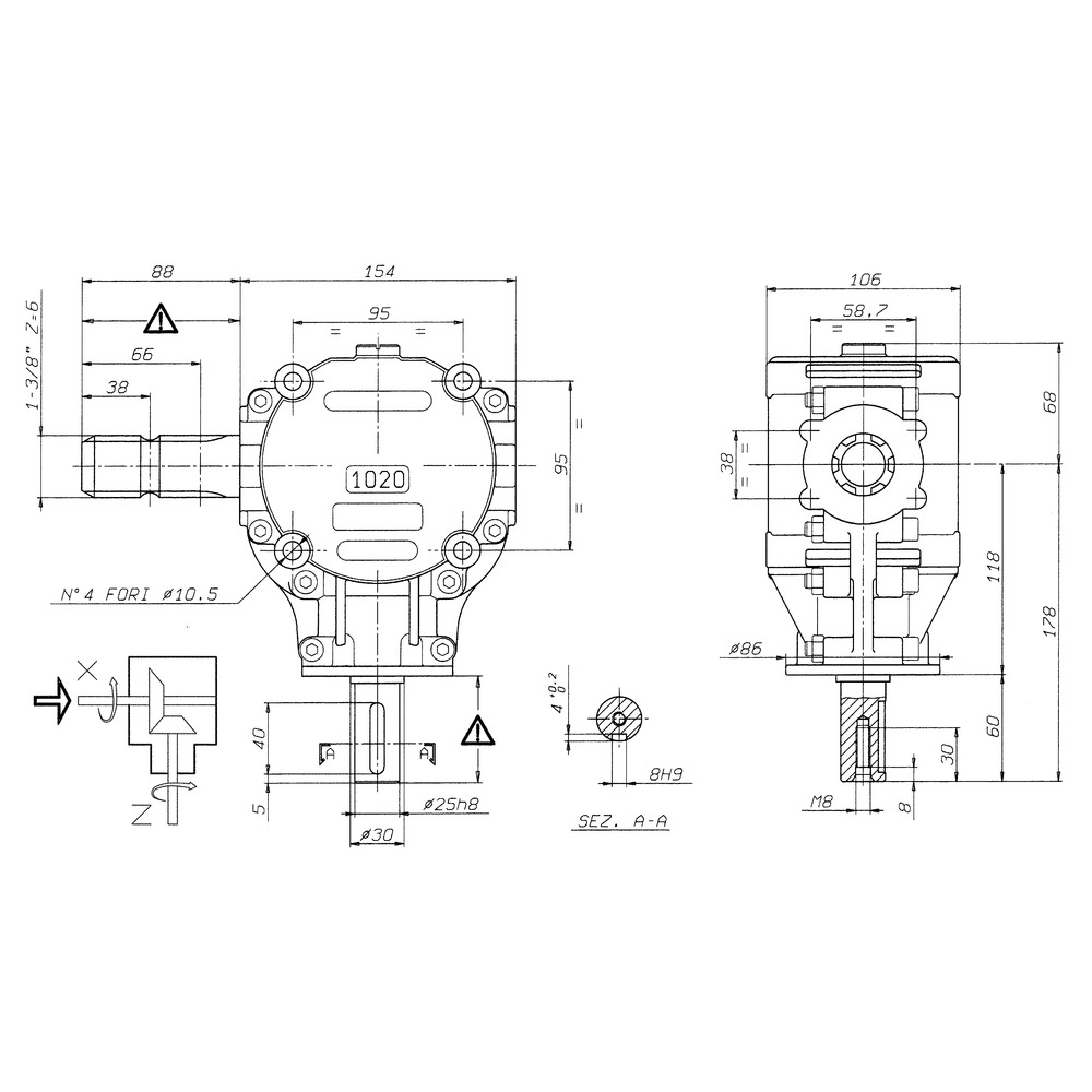 Das Winkelgetriebe 1020 ist ein kompaktes und leichtes Getriebe, das für den Einsatz in Kreissägen konzipiert ist. Das Getriebe hat ein Übersetzungsverhältnis von 1:2,78, was bedeutet, dass die Drehzahl am Ausgang des Getriebes 2,78-mal höher ist als die Drehzahl am Eingang. Die Drehrichtung der Ausgangswelle ist umgekehrt zur Drehrichtung der Eingangswelle (auf das sichtbare Wellenende gesehen). Das Winkelgetriebe ist mit einem hochfesten Aluminiumgehäuse, am Eingang mit einem Zapfwellenprofil 1 3/8 x 6 und einer Ausgangswelle mit einem Durchmesser von 25 mm ausgestattet. Das Getriebe kann Drehmomentspitzen bis zum 2-fachen des Nenndrehmoments aufnehmen. des Nenndrehmoments aufnehmen.Wir weisen Sie darauf hin, dass eine Überlastsicherung gemäß den Leistungsdaten des Getriebes zu verwenden ist. Achtung vor Inbetriebnahme des Getriebes den Ölstand auffüllen und kontrollieren. Die maximale Leistungsübertragung beträgt bei 540U/min 9kW und bei 1000U/min 13kW.