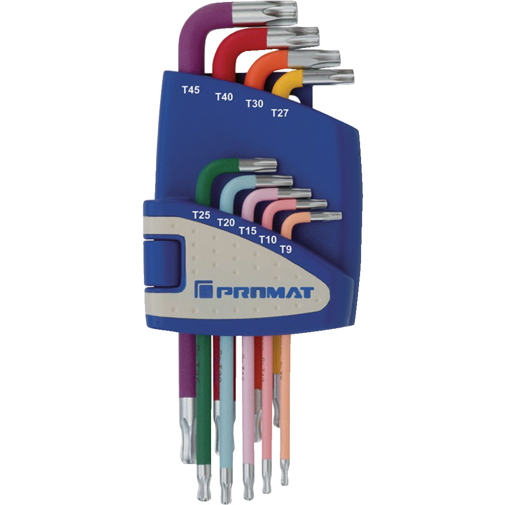 Praktisches Set mit Winkelschraubendrehern mit Kugelköpfen aus hochwertigem, verchromten S2 Stahl. Für Schrauben mit Innen TORX Profil. Ein schnelles Auffinden der verschiedenen Schlüsseln ist durch die Farbcodierung immer möglich. Inhalt: T 9, T 10, T 15, T 20, T 25, T 27, T 30, T 40, T 45