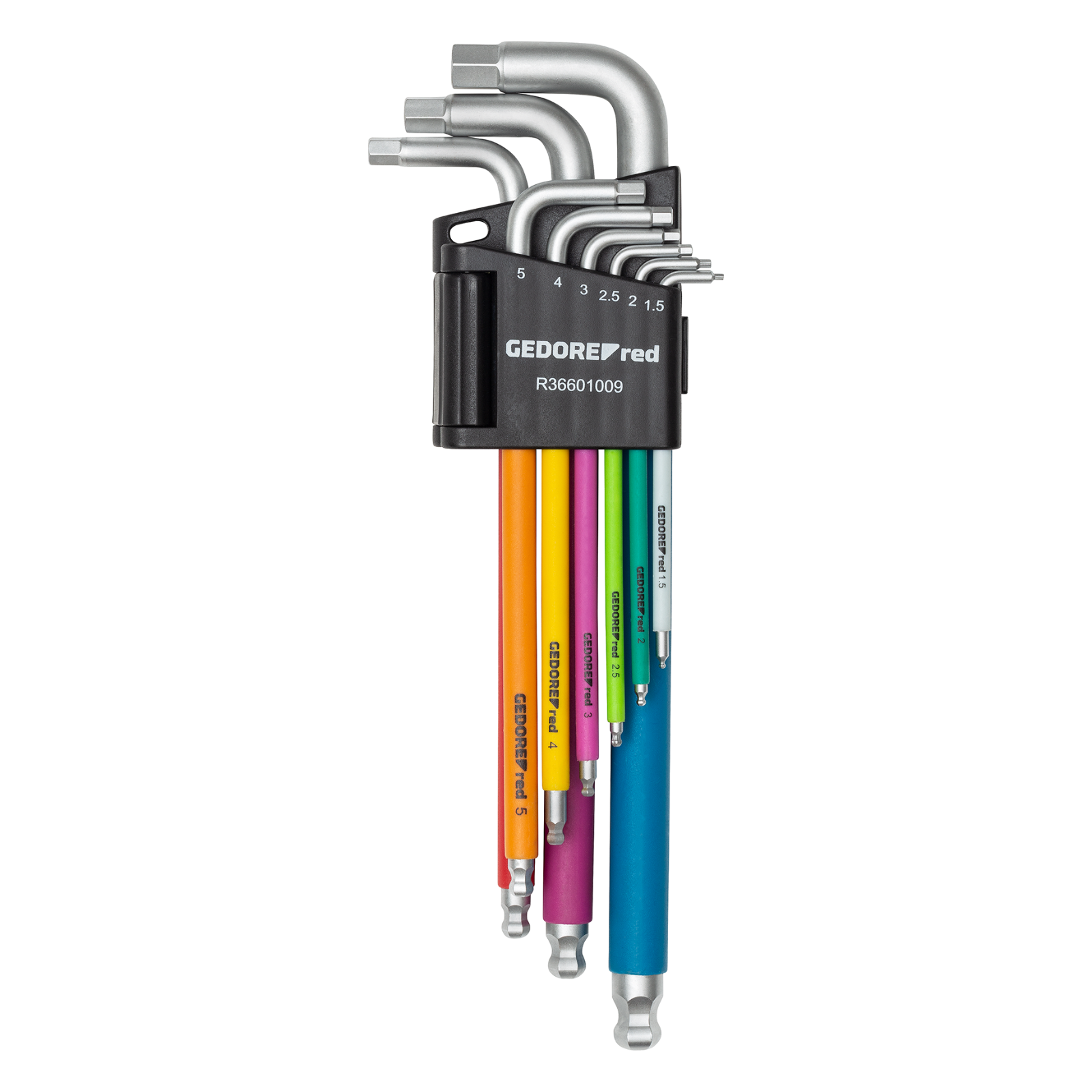 Farbcodierung mit Kunststoffbeschichtung für schnelleres Auffinden des passenden Winkelschlüssels.