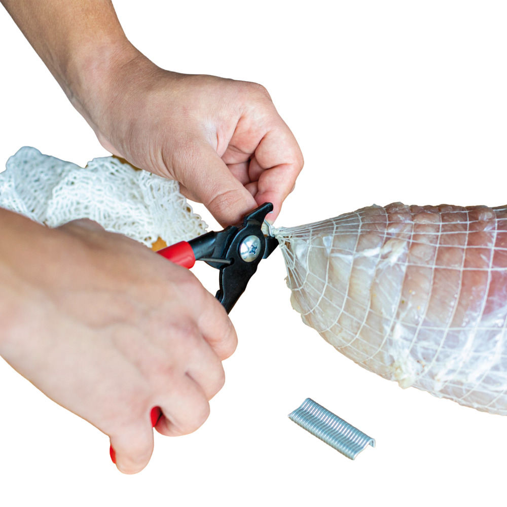 Zum Verschließen von Wursthüllen, Därmen und Netzen. Set inkl. 60 Metallclips.Anwendung:Den Clip mit der Vertiefung am Ende der Zange platzieren. Den Wurstverschließer anschließend an die gewünschte Stelle z. B. des Darmes anlegen und das Gerät zudrücken!
