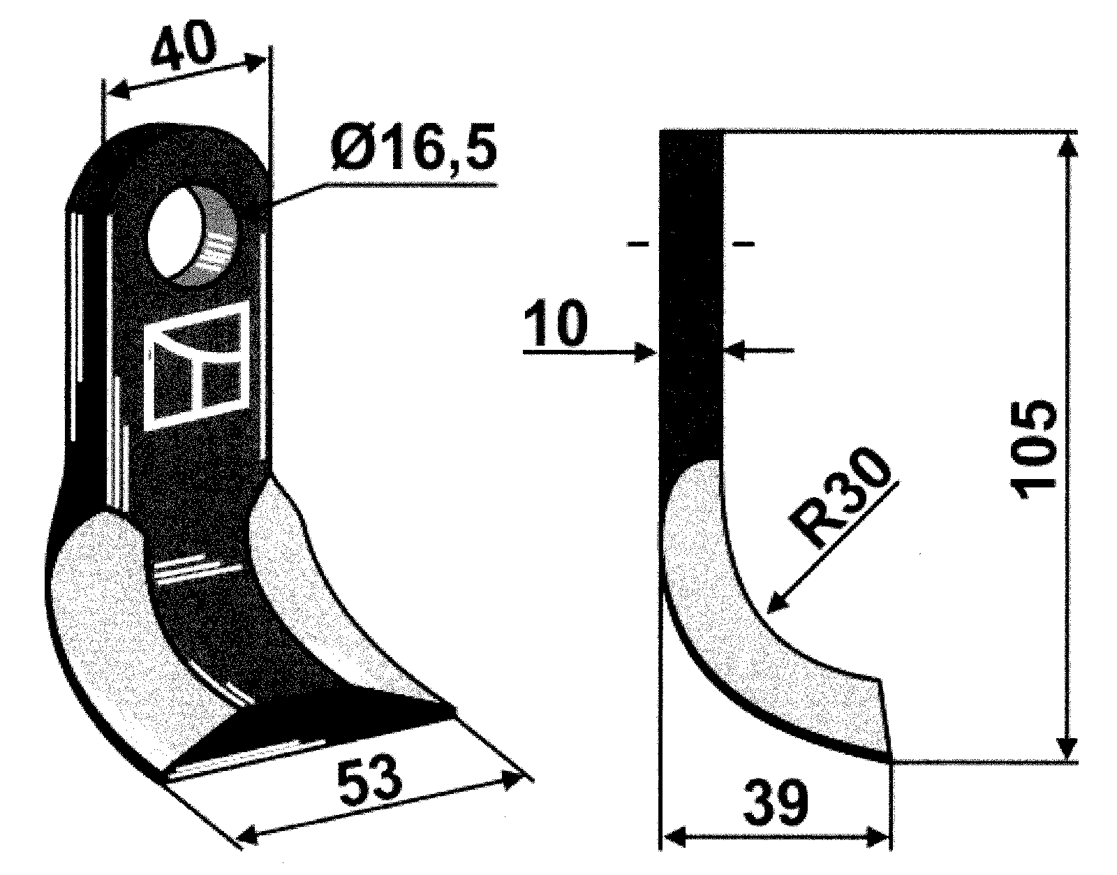 Schlegelmesser 105 x 40 mm mit Bohrung 16,5 mm passend zu Fischer, HMF-FREI und Palladino. Die Y-Messer werden paarweise mit einem Schrauben M16x1,5x80 mm in der Festigkeit 10.9 auf der Schlegelmäherwelle befestigt.