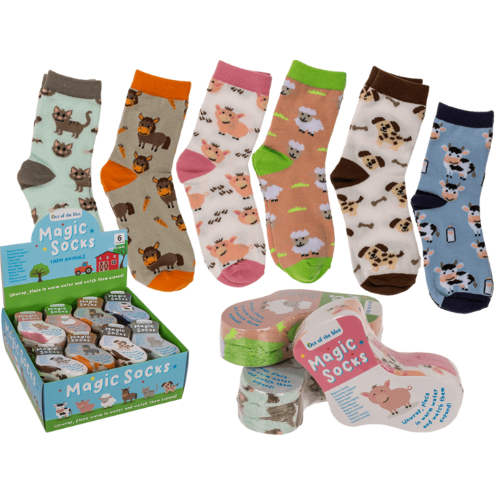 Einheitsgröße 22-34, Motive: Katze, Kuh, Esel, Schaf, Hund und Schwein- nicht frei wählbar, Socken ins Wasser legen und überraschen lassen! 72 % Baumwolle, 23 % Polyester und 5 % Elasthan.Magische Kindersocken sind ein faszinierendes Produkt, das Kindern eine zauberhafte Erfahrung bietet. Diese speziellen Socken sind mit niedlichen Farmtier-Motiven versehen und haben eine einzigartige Eigenschaft. Sie sind in gepresstem Zustand, aber wenn sie mit Wasser in Berührung kommen, entfalten sie sich und zeigen ihre volle Pracht.Die Zaubersocken sind in sechs verschiedenen Motiven erhältlich: Katze, Kuh, Esel, Schaf, Hund und Schwein. Jedes Motiv ist liebevoll gestaltet und bringt die charakteristischen Merkmale des entsprechenden Tieres zum Ausdruck. Kinder werden begeistert sein, wenn sie sehen, wie sich die Socken langsam entfalten und die Tiere zum Vorschein kommen.Die Socken haben eine Einheitsgröße von 22 bis 34, was bedeutet, dass sie für Kinderfüße in diesem Größenbereich geeignet sind. Das elastische Material besteht aus 72 % Baumwolle, 23 % Polyester und 5 % Elasthan. Dies sorgt für ein angenehmes Tragegefühl und eine gute Passform.Um die magische Entfaltung zu erleben, müssen die Kindersocken einfach ins Wasser getaucht werden. Sobald sie mit dem Wasser in Berührung kommen, beginnen sie sich aus zu breiten und das niedliche Farmtier-Motiv zu enthüllen.Diese Verwandlung wird Kindern Freude bereiten und ihnen eine magische Erfahrung bieten.Magische Zaubersocken mit Farmtiere-Motiven sind nicht nur ein lustiges Accessoire, sondern auch ein originelles Geschenk für Kinder.MOTIV NICHT FREI WÄHLBAR