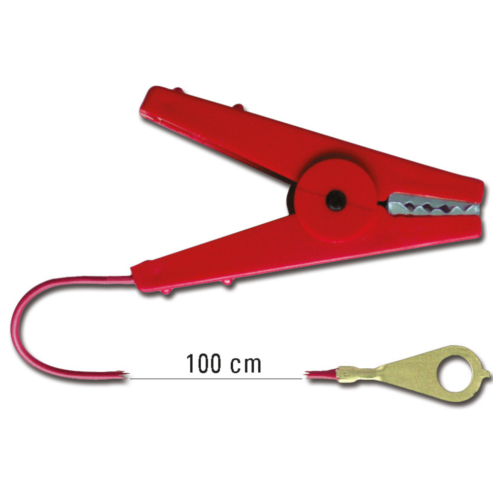Geeignet zum Anschluss von Litzen und Seilen. Mit robuster Krokodilklemme, Kabellänge 100 cm, mit M8-Metallöse.