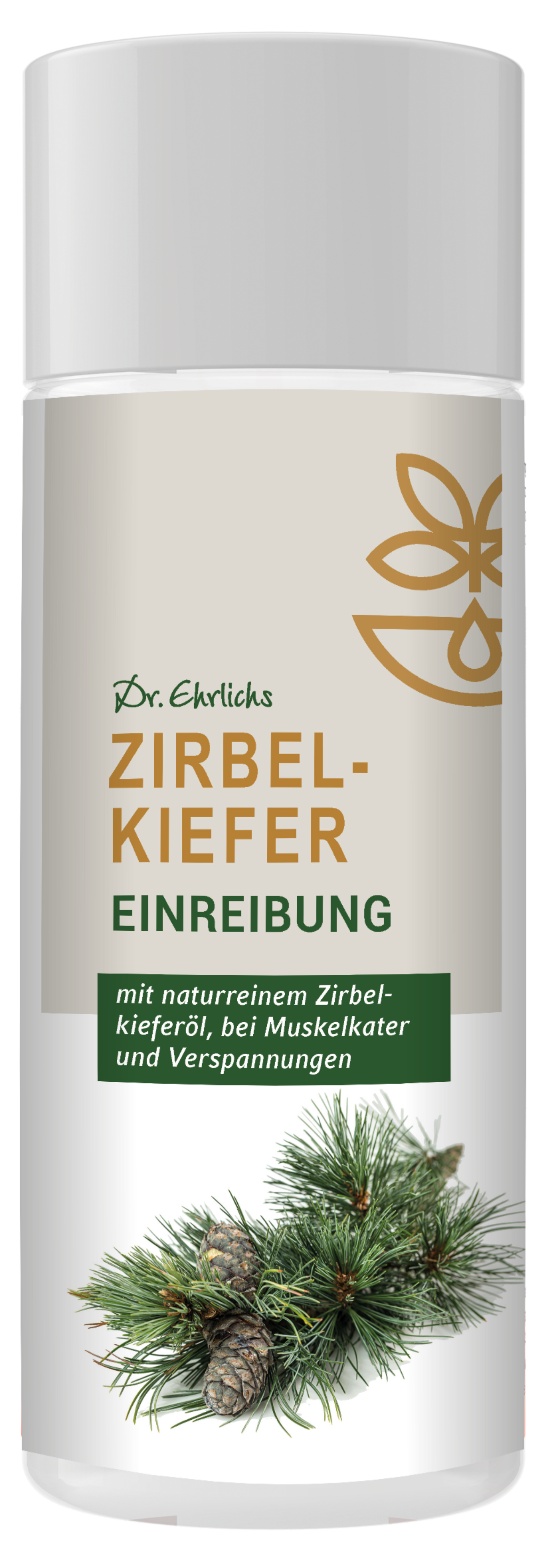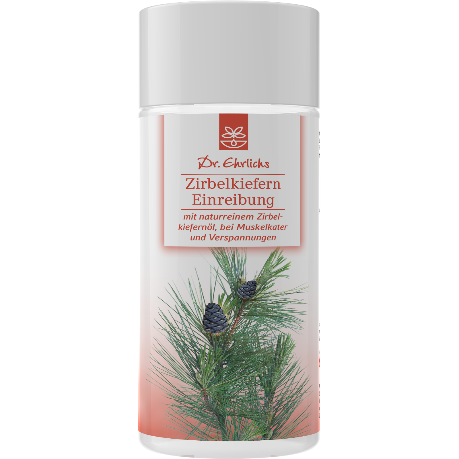 Dr. Ehrlichs Zirbelkiefern-Einreibung - Für bewegliche Gelenke und MuskelnDr. Ehrlichs Zirbelkiefern-Einreibung ist eine hochwertige Behandlung mit echtem Zirbelkiefernöl.Sie fördert die Durchblutung, vitalisiert und kühlt zugleich – ideal bei Muskelkater und Verspannungen in Rücken, Nacken, Schultern, Knie, Hüfte und Ellbogen.Die Einreibung dringt tief ins Gewebe ein und entfaltet dort ihre langanhaltende Wirkung.Der wohltuende Duft von Kampfer und Zirbelkiefer begleitet die Anwendung, während die ätherischen Öle die Haut intensiv pflegen.Perfekt geeignet für eine erfrischende und entspannende Pflege von Gelenken und Muskeln.Inhalt: 250 ml.Anwendung:Hochwertige Einreibung mit naturreinem Zirbelkiefernöl. Vitalisierend und kühlend – kann anWirbelsäule, Nacken und Schulter, Schultergelenken, Knie, Hüfte und Ellbogen angewendet werden.Nicht am ganzen Körper anwenden. Die ätherischen Öle der Zirbelkiefer entfalten ihrelanganhaltende Wirkung nach dem Einmassieren in den entsprechenden Regionen.Die Einreibungverströmt einen wohltuenden Duft von Kampfer und würziger Zirbelkiefer.Hinweis:In der Flüssigkeit können sich 2 Phasen bilden (Naturprodukt).Bitte deshalb die Einreibung vorBenutzung kurz schütteln.Kosmetikprodukt zur äußerlichen Anwendung.Kontakt mit den Augen undSchleimhäuten vermeiden.Nicht für Säuglinge und Kleinkinder geeignet.Inhaltsstoffe:Aqua, Alcohol denat., Isopropyl Alcohol, Polysorbate 80, Pinus Cembra Leaf/Twig Oil, Menthol,Glycerin, Camphor, Limonene