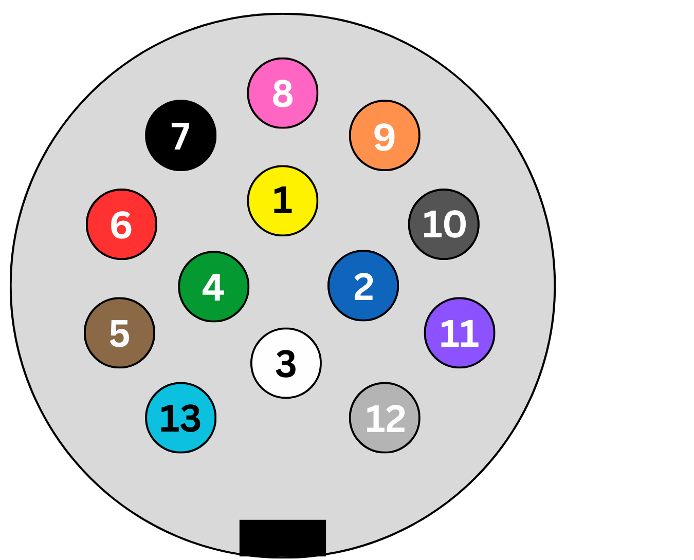 (Die Stecker sind nach einer vordefinierten Nummerierung bzw. nach der zugeteilten Funktion anzuschließen. Die Ziffern sind wie in einem runden Stecker angeordnet. Die Kabelfarben sind informativ, nicht verbindlich. Nur die Nummerierung legt die Funktion eindeutig fest.)
