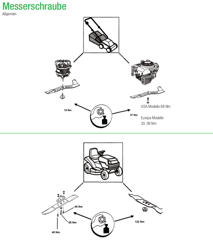 Wie bei allen „kritischen beweglichen Teilen“ (Beispiel Kraftfahrzeugräder) muss auch bei Rasenmähern und Traktoren auf das richtige Anzugsmoment geachtet werden. Auch hier ist es nicht empfehlenswert, die Schraube(n) mit voller Kraft anzuziehen, da ansonsten genau das Gegenteil bewirkt wird.