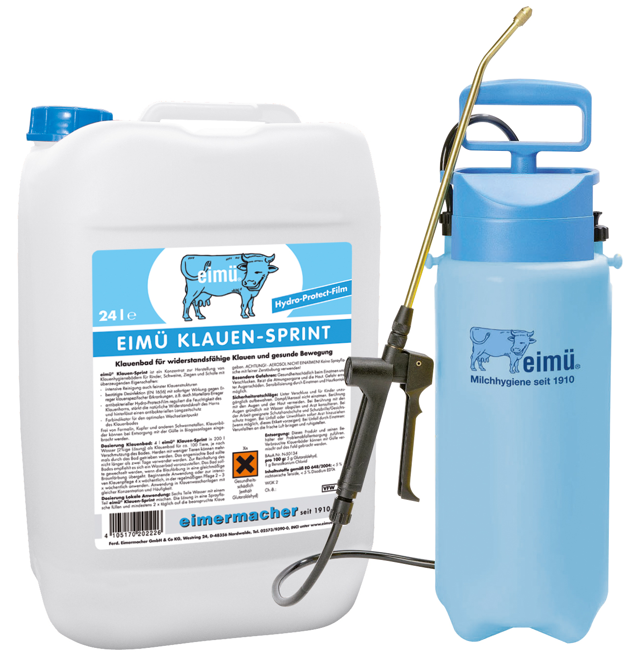 Die Beschwerden einer Herde zeigen sich in der Regel zyklisch im Abstand von 6–12 Wochen. Als Maßnahme ist das Produkt eimü Klauen-Sprint zum Aufsprühen ganzjährig auf die ganze Herde auf die Ballen der Hinterklauen zweimal pro Woche im Abstand von 2–3 Tagen hoch effektiv. Die Einzigartigkeit des eimü Klauen-Sprint ist die hochwirksame, sehr gut hautverträgliche und stark hautpflegende Formulierung. Die spezielle Rezeptur vermag auch bei üblich verschmutzten Klauen tief in anaeroben Klauenstrukturen einzudringen. Ein Aufsprühen direkt auf die ungesäuberte Klaue ist ohne Einschränkung möglich. Der spezielle Pflegefilm (Hydro-Protect-Film) reguliert die Feuchtigkeit der Haut ideal und deckt die Haut und die Wunde mit einem Sprühpflaster- Schutzfilm ab. So wird die Wunde vor neuer Beschmutzung geschützt. Die Summe dieser Effekte begünstigt und begleitet eine zügige natürliche Abheilung der Mortellaro. Die Erfahrung zeigt, dass mit dieser zweimal in der Woche praktizierten Routine-Prophylaxe die regelmäßig wieder aufkommenden Mortellaroschübe ausbleiben.
