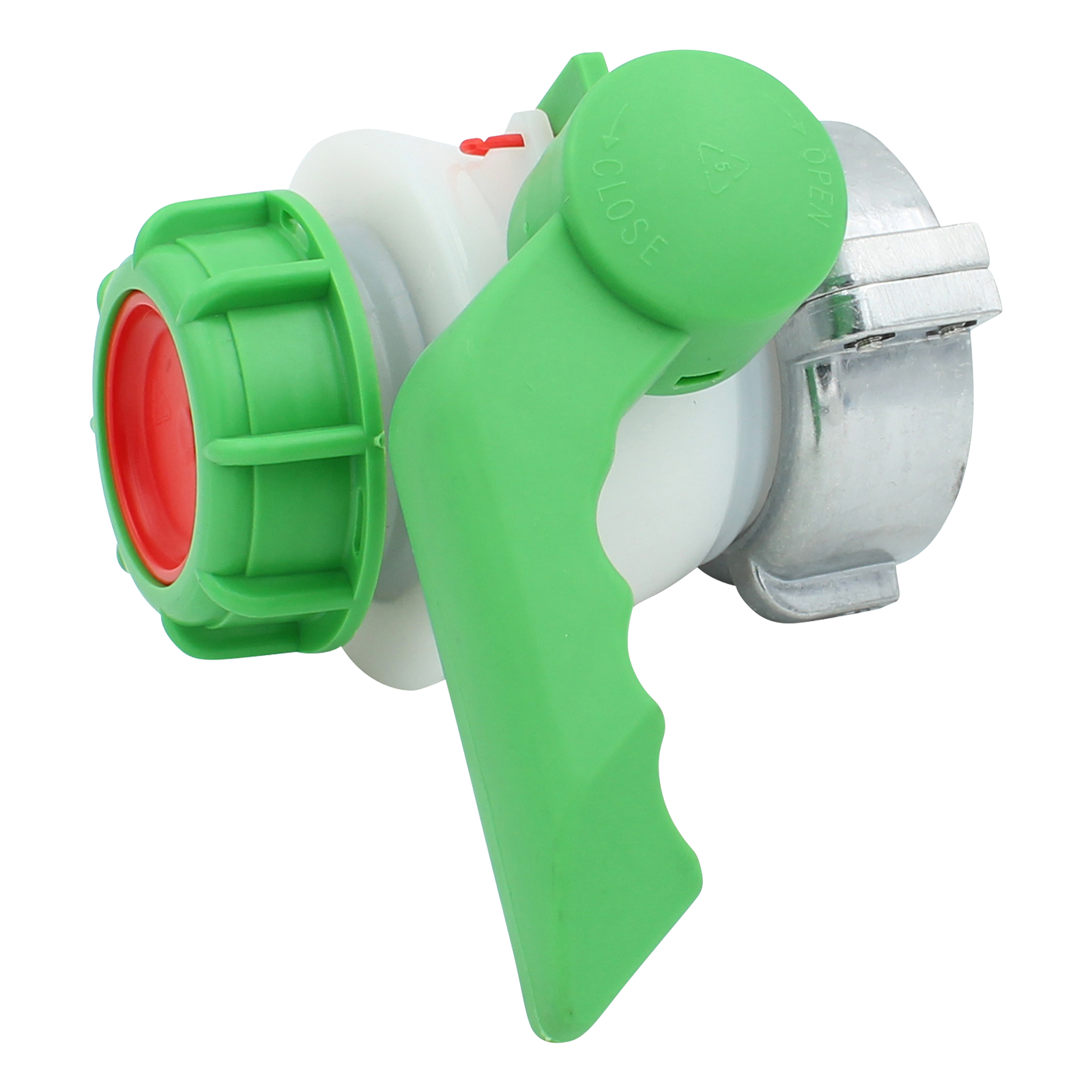 High-quality ball valve for IBC system with an S75x6 external thread on the inner container. The tap has a locking bracket and a shut-off screw, which must be removed before opening for the first time. A rotating union nut made of aluminum serves as protection against rotation during assembly.