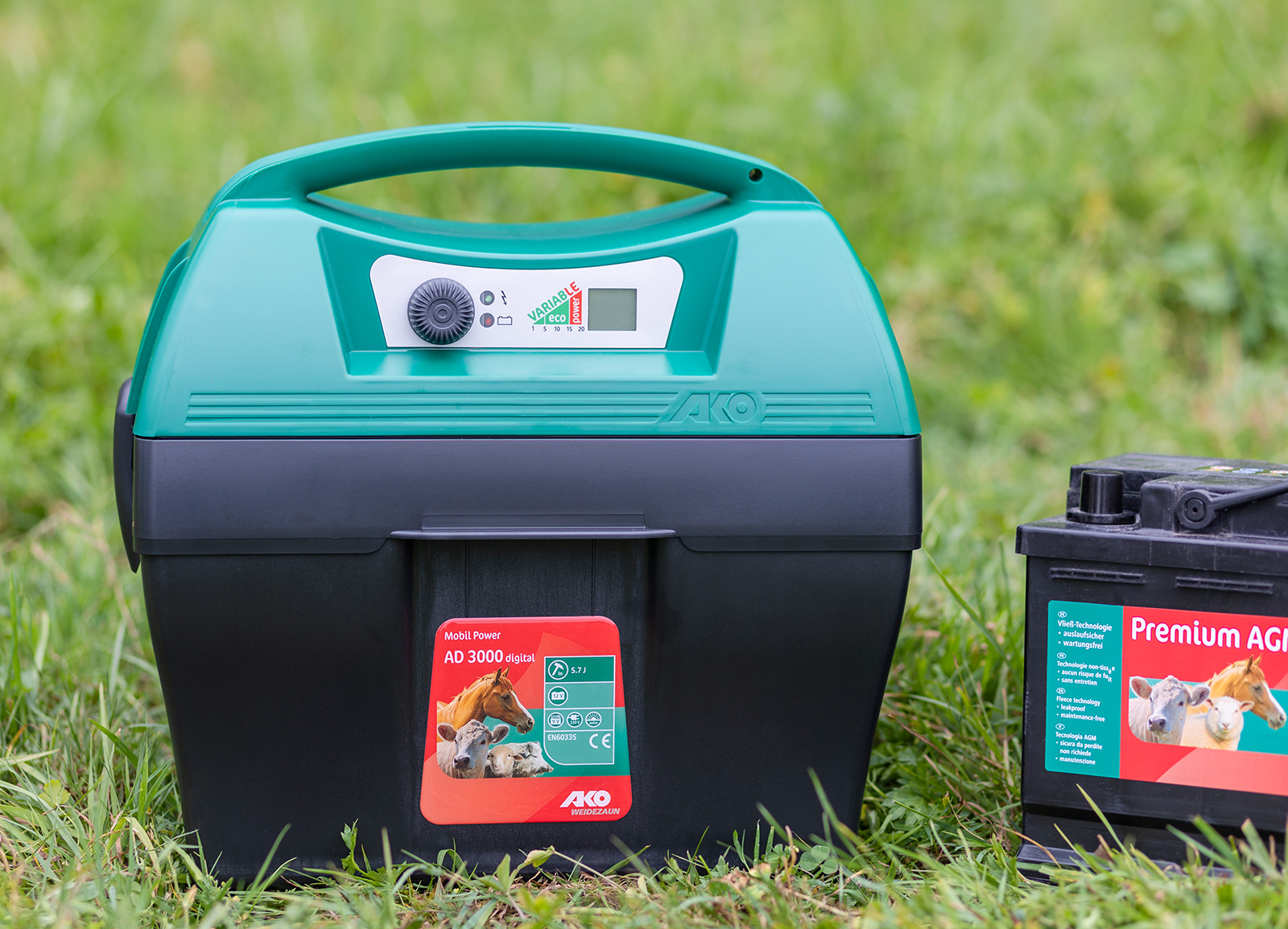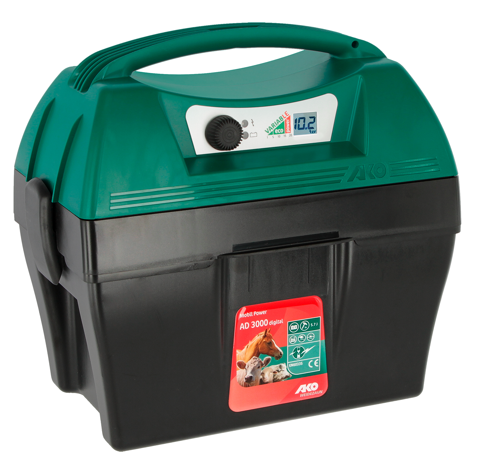 Impact power and fence length: With 7.40 J charging energy and 11,000 V voltage, the AKO Mobil Power AD 5000 digital is suitable for fences up to 38 km without vegetation. INFO: Remove vegetation regularly in order to avoid leakage and increase fence safety