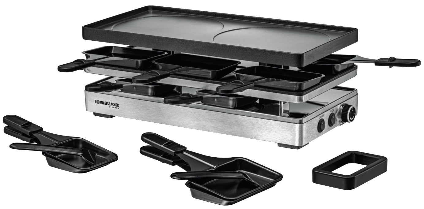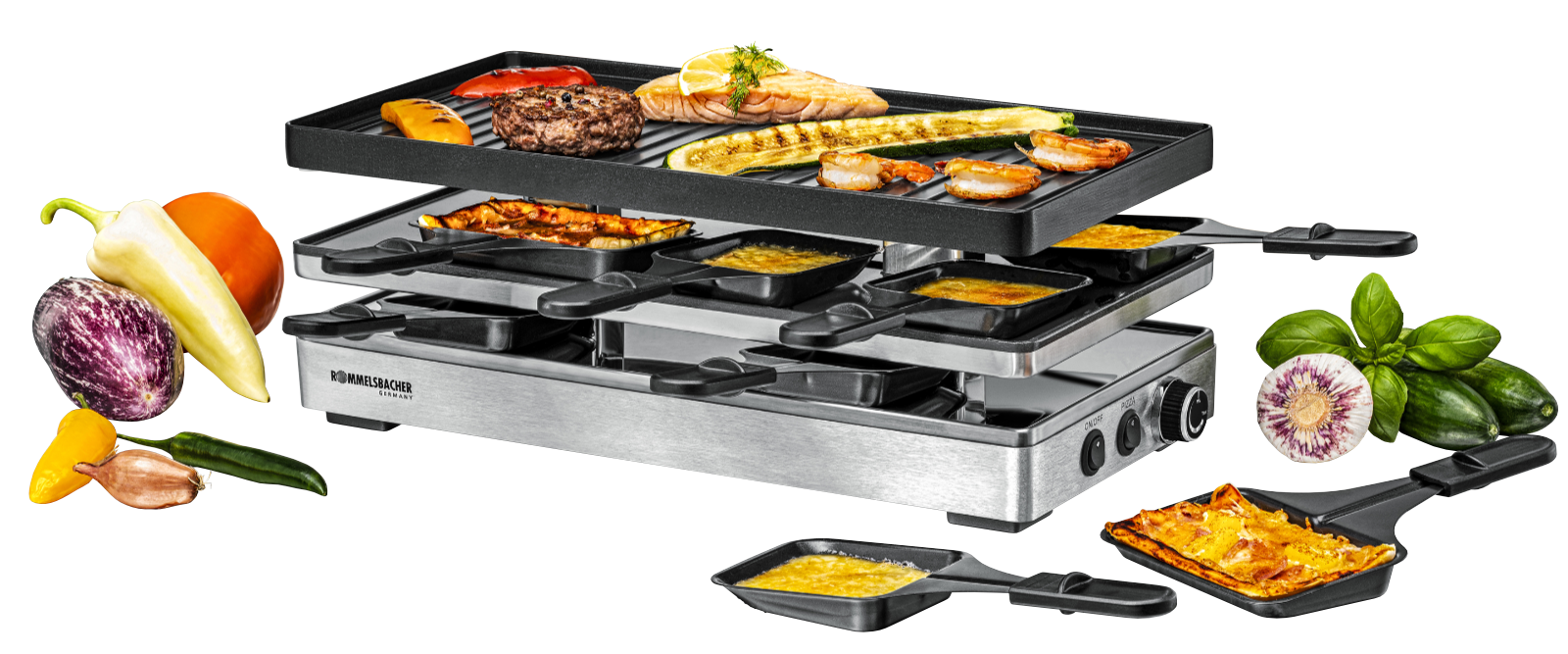 - as a raclette grill with 8 pans, as a pizza station (with bottom heat) for 6 pans,
