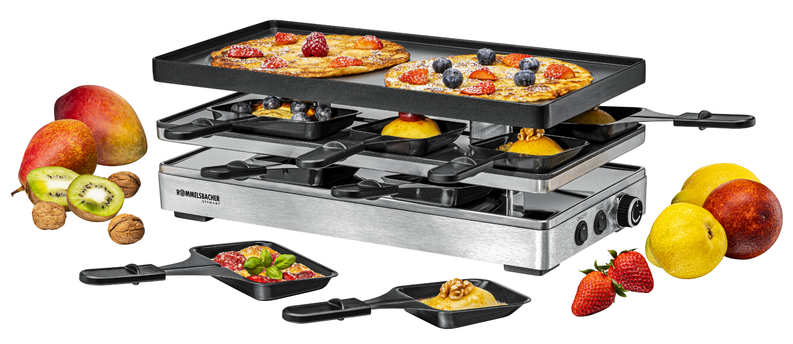 Use it flexibly: classic raclette, mini pizzas with a crispy base, crêpes, or grilled dishes.