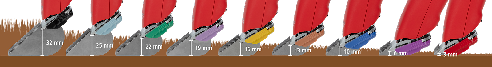 Tip: Add the cutting length of the clipper head to the cutting height of the stainless steel attachment comb, e.g., GT330 1.5 mm + GTA133 brown = cutting length 14.5 mm