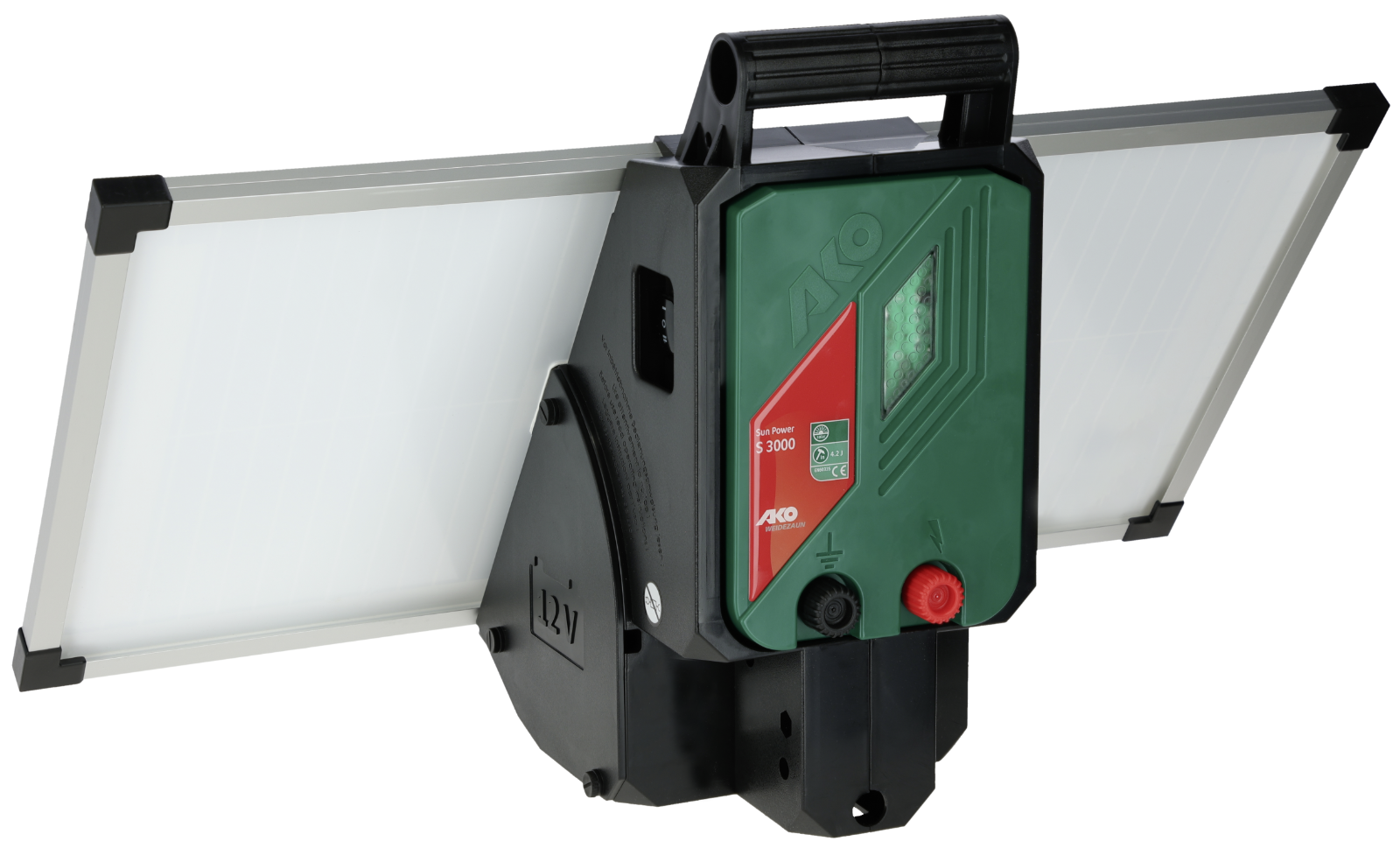 The device is optimized for maintenance-free continuous operation throughout the main grazing season, has a high /Low/Off switch, fence control LED and separate battery warning display, with integrated lightning protection, intelligent, modern battery management with deep discharge protection, works even in longer periods of bad weather, excellent efficiency - therefore longer battery life, with very robust and weather-resistant, waterproof housing with carrying handle. Quick and easy to install!