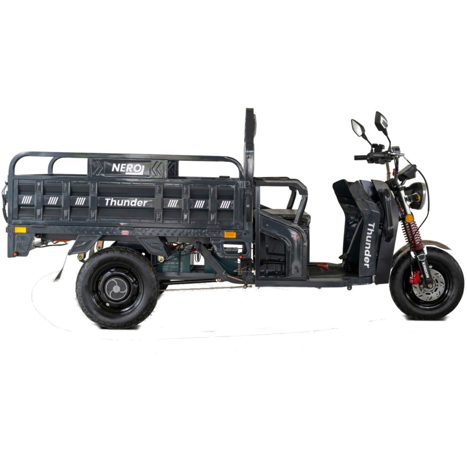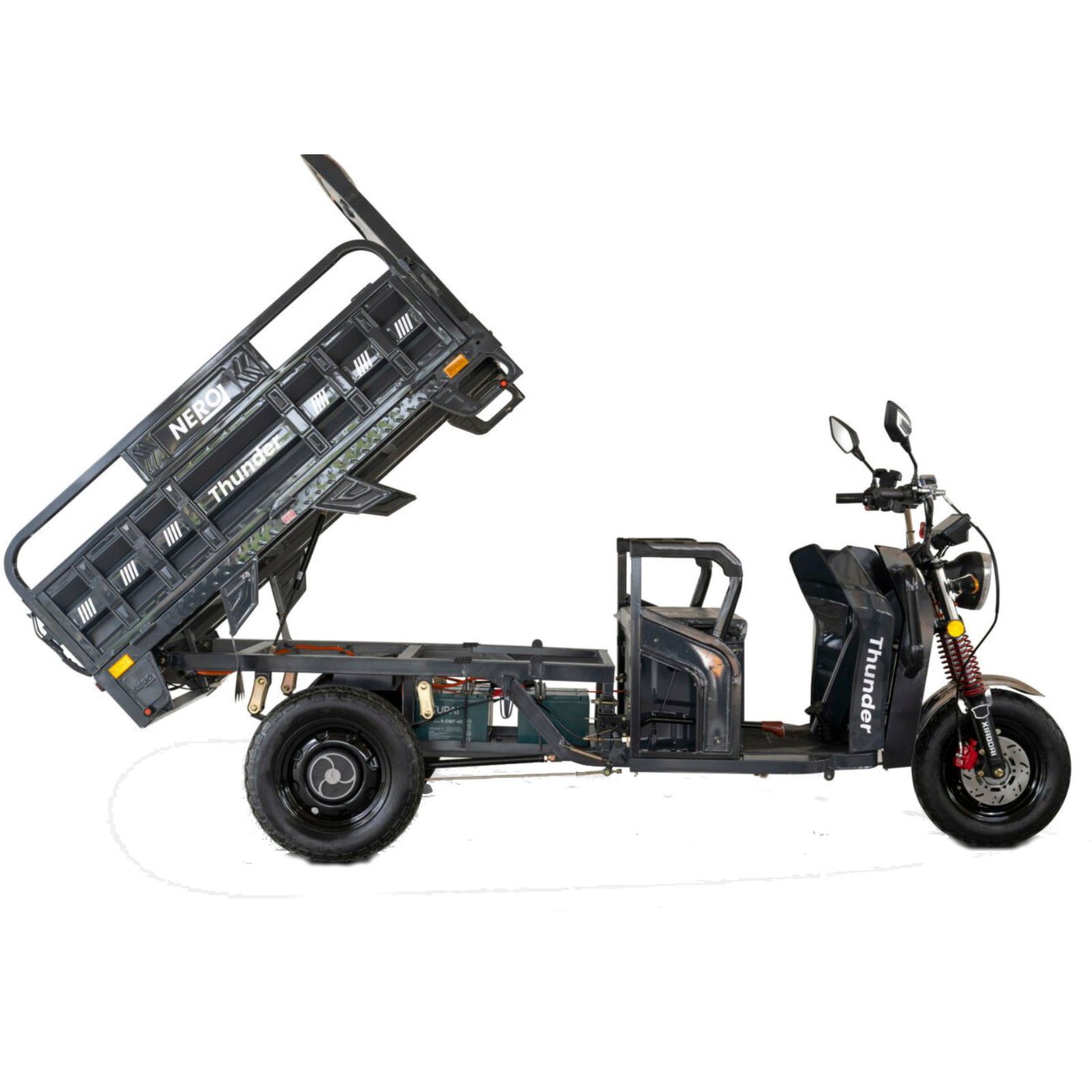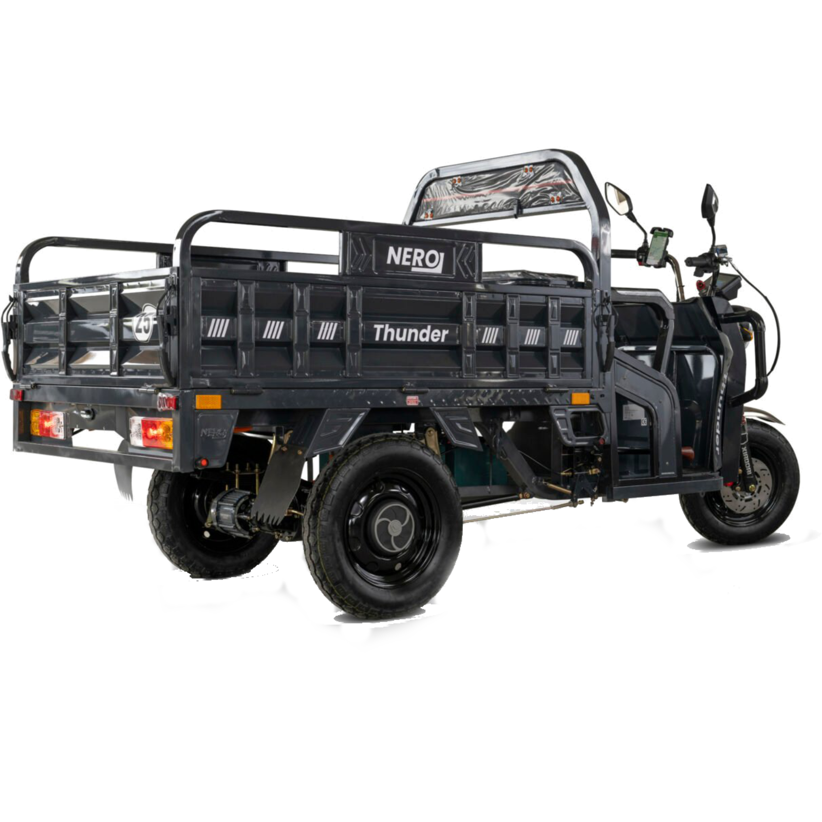The all-rounder has a 600W electric motor and a large, tiltable loading area on which 300 kg can easily be loaded , fitted. The strong and long-lasting 45 Ah battery is fully charged in 6-8 hours and offers a range of approximately 50-80 km. The maximum speed is 25 km/h, which is why the device is classified as a bicycle according to current legal regulations (in Austria). This means that you can drive on all roads without registering. Another advantage of the device is that the NERO Thunder has larger pneumatic tires mounted on the rear axle (4.00-12).