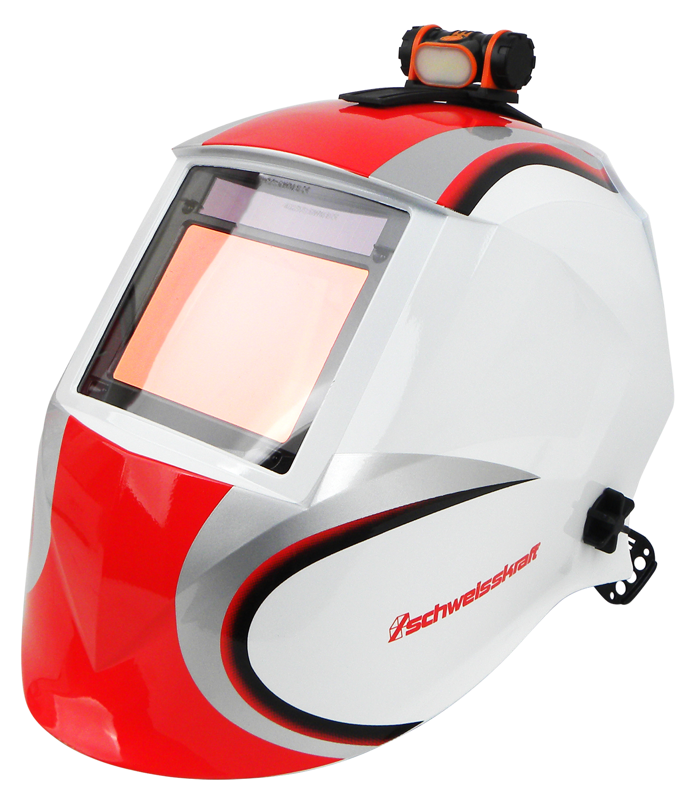 Fully automatic welding head shield suitable for use with electrode, MIG/MAG, and TIG welding, as well as for grinding work. Lightweight at only 0.55 kg, making it comfortable to wear. Extra-large viewing window measuring 100x73 cm for optimum visibility of the workpiece. Infinitely variable adjustment of protection levels and sensitivity. With replaceable lithium battery. New model with 2-stage LED light attached to the helmet for perfect illumination of the work area.