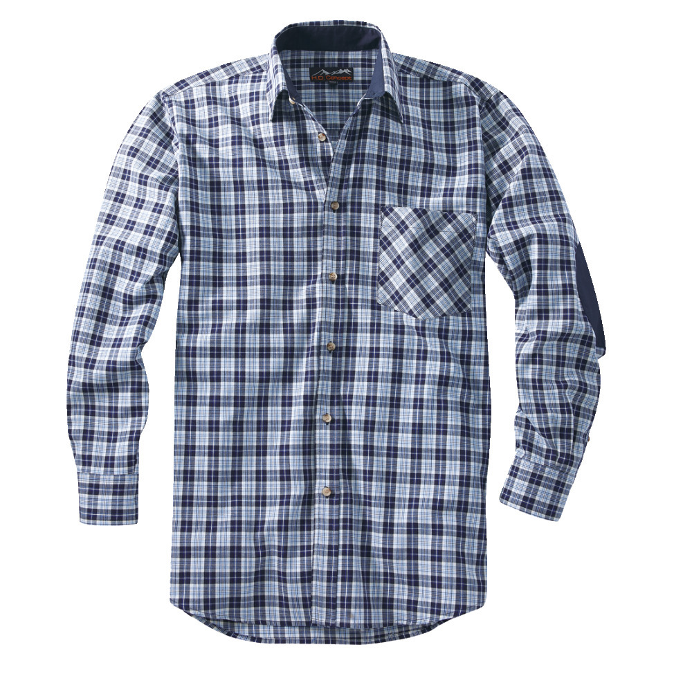 Yarn-dyed, light quality, collar, button placket and cuffs on the inside in a contrasting look, elbow trimmings, breast pocket and hanger on the back. Material: 100% cotton. Size: 41/42, 43/44, 45/46, 47/48.